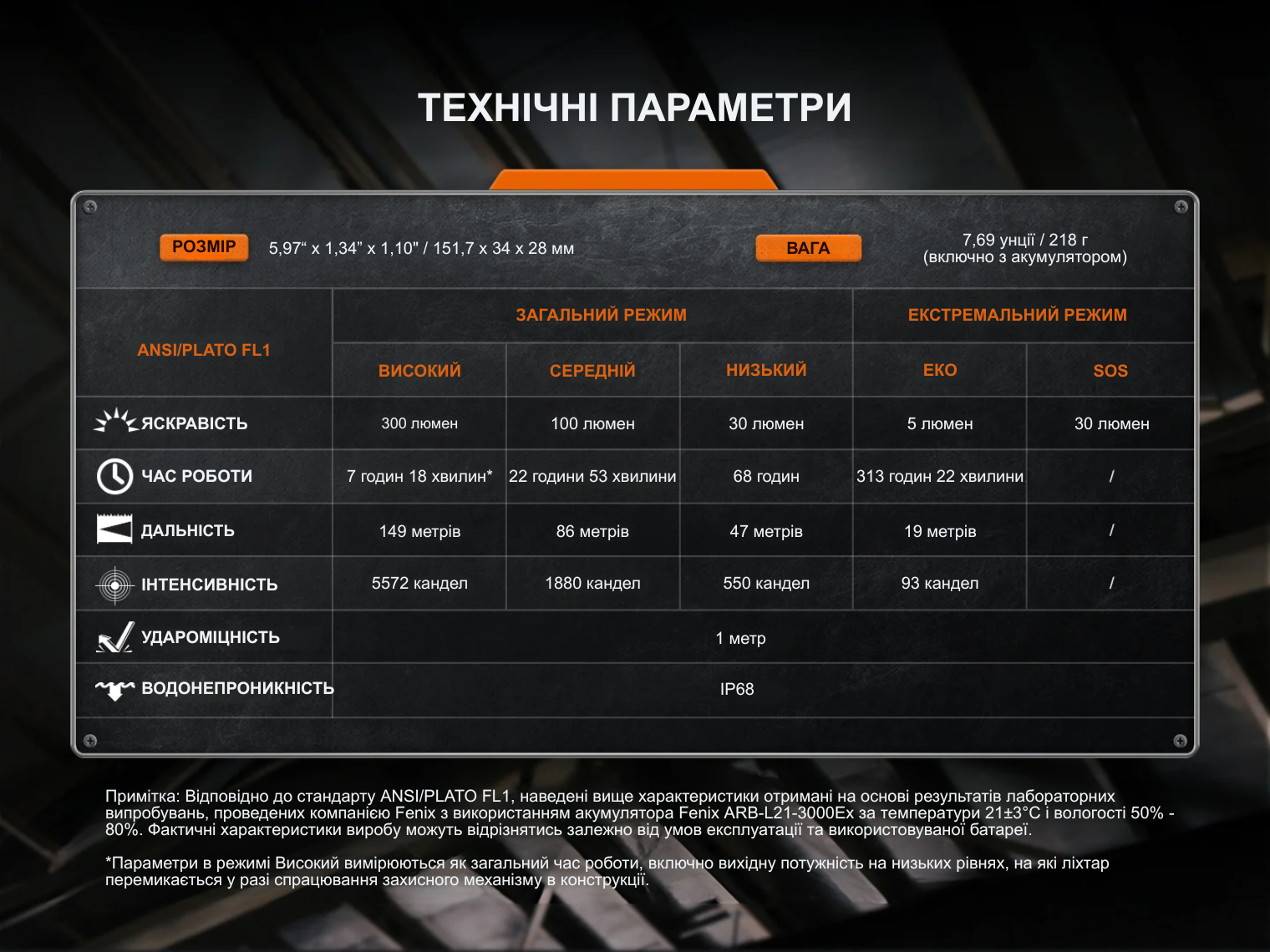 Ліхтар працює від спеціального акумулятора Fenix ARB-L21-3000Ex. Він є вибухозахищеним та розробленим для стабільної роботи в умовах екстремально високих і низьких температур, що гарантує безпеку використання у вибухонебезпечних зонах. Ємність акумулятора збільшена до 3000 мАгод (у попередній моделі було 2600 мАгод).