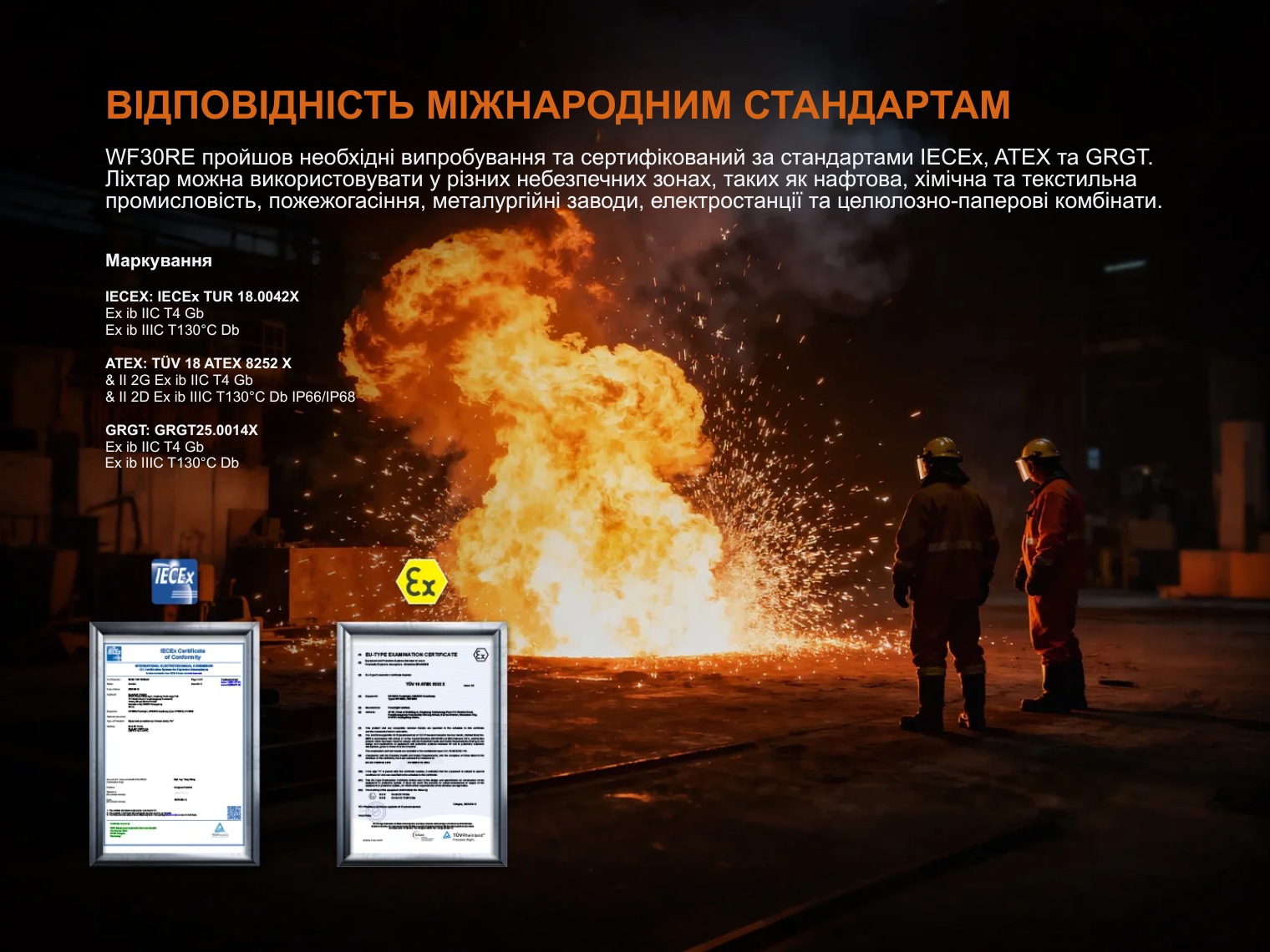 Ліхтар офіційно схвалений для використання у місцях, де присутні вибухонебезпечні газові суміші IIA, IIB та IIC (Зони 1 та 2), а також у зонах із горючим пилом (Зони 21 та 22).
