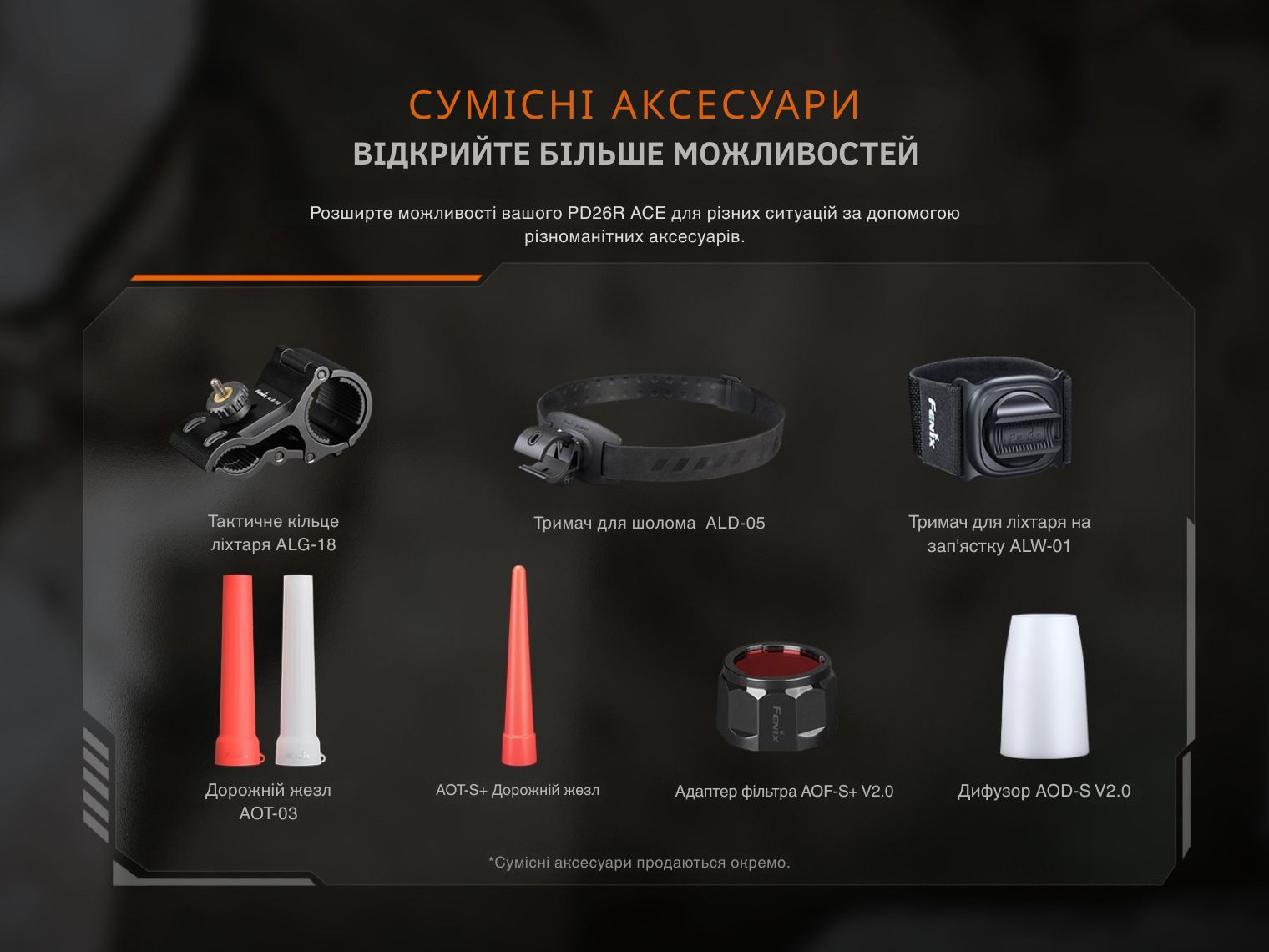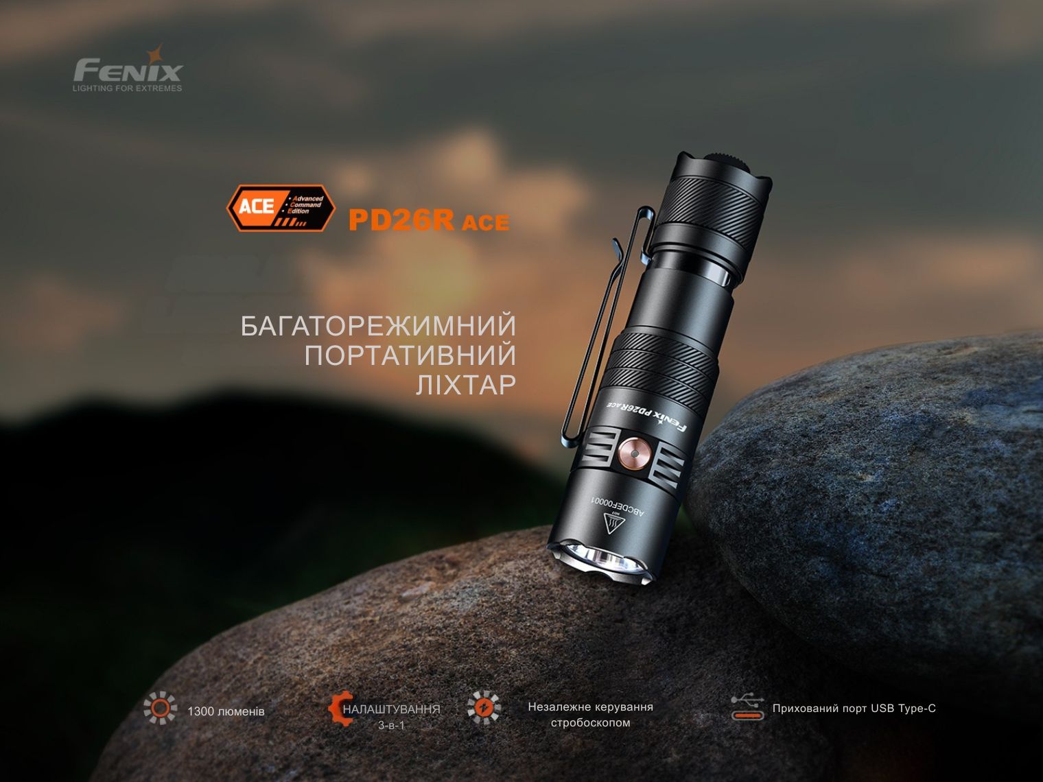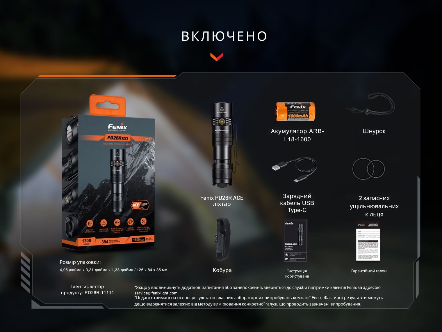 Ліхтар Fenix PD26R ACE, акумулятор 18350 на 1600 мАгод (ARB-L18-1600), кабель USB Type-C, чохол, темляк, 2 запасні ущільнювальні кільця, інструкція користувача, гарантійний талон.