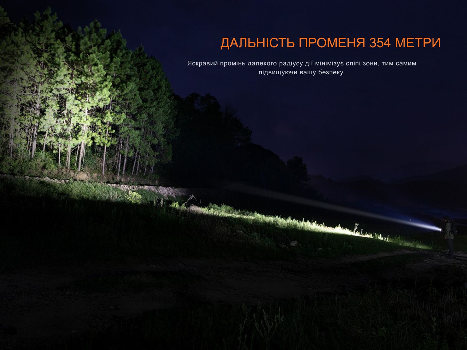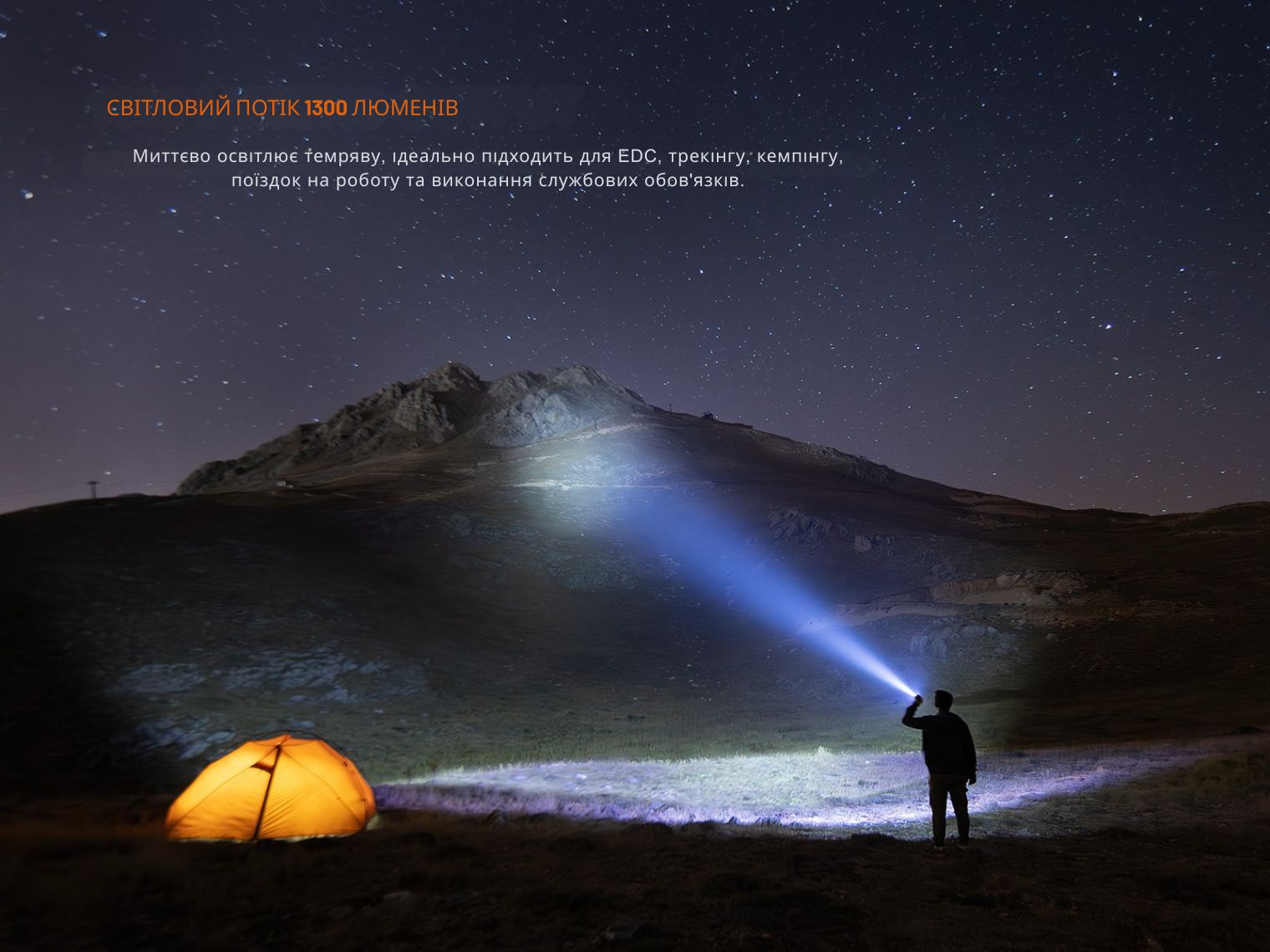 - Турбо: 1300 лм – 31404 кд – 1 год 2 хв – 354 м;