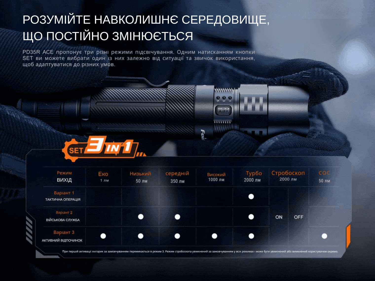 - тактичний ліхтар Fenix PD35R ACE з інноваційною системою налаштування інтерфейсу;