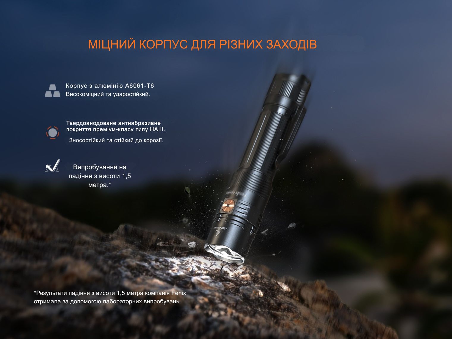 Ліхтар працює від одного Li-ion акумулятора 21700. Цей елемент постачається в комплекті — фірмовий Fenix ARB-L21-5000 V2.0 (5000 мАгод).