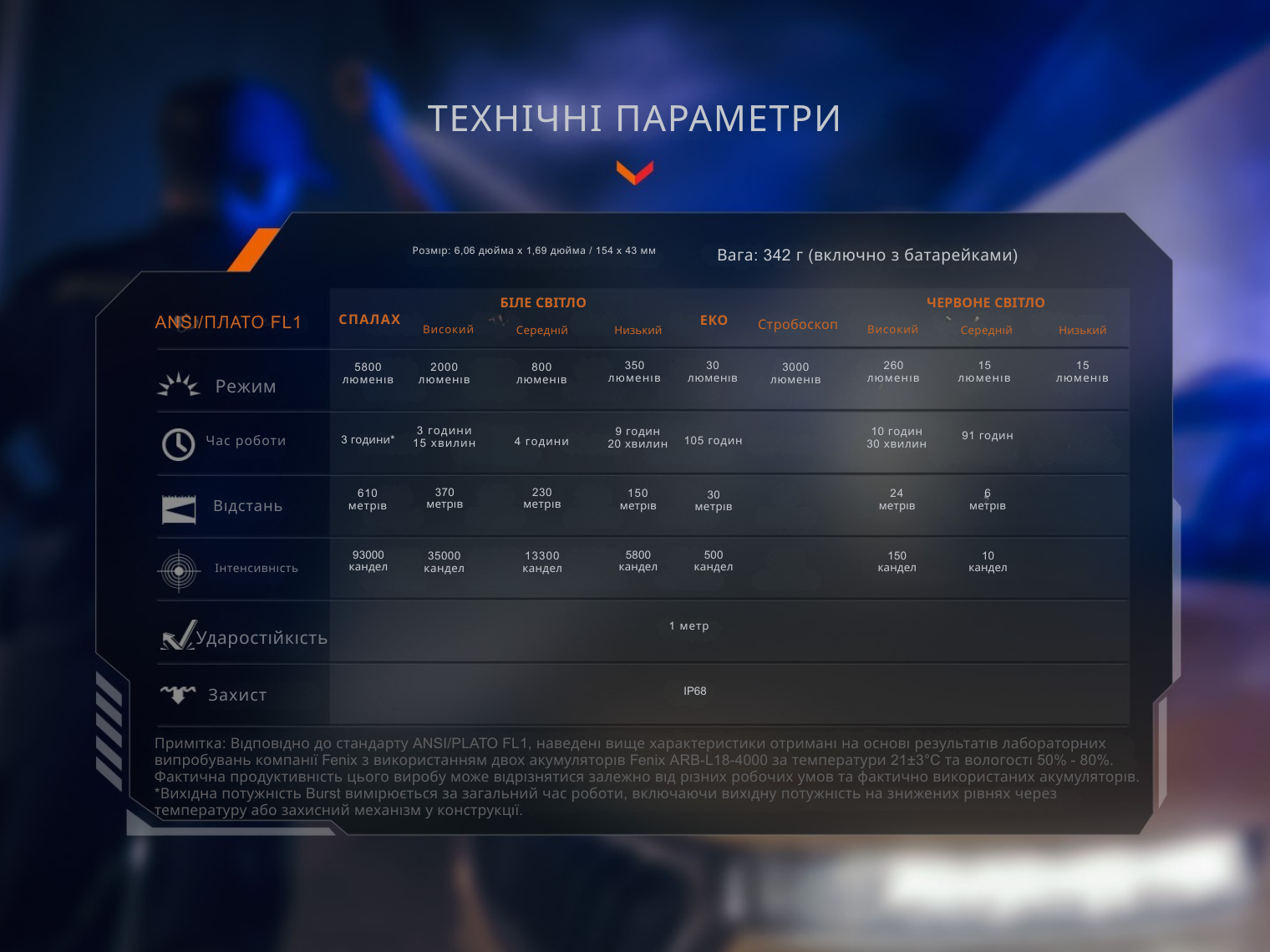 - Спалах: 5800 лм – 93000 кд – 3 год – 610 м;