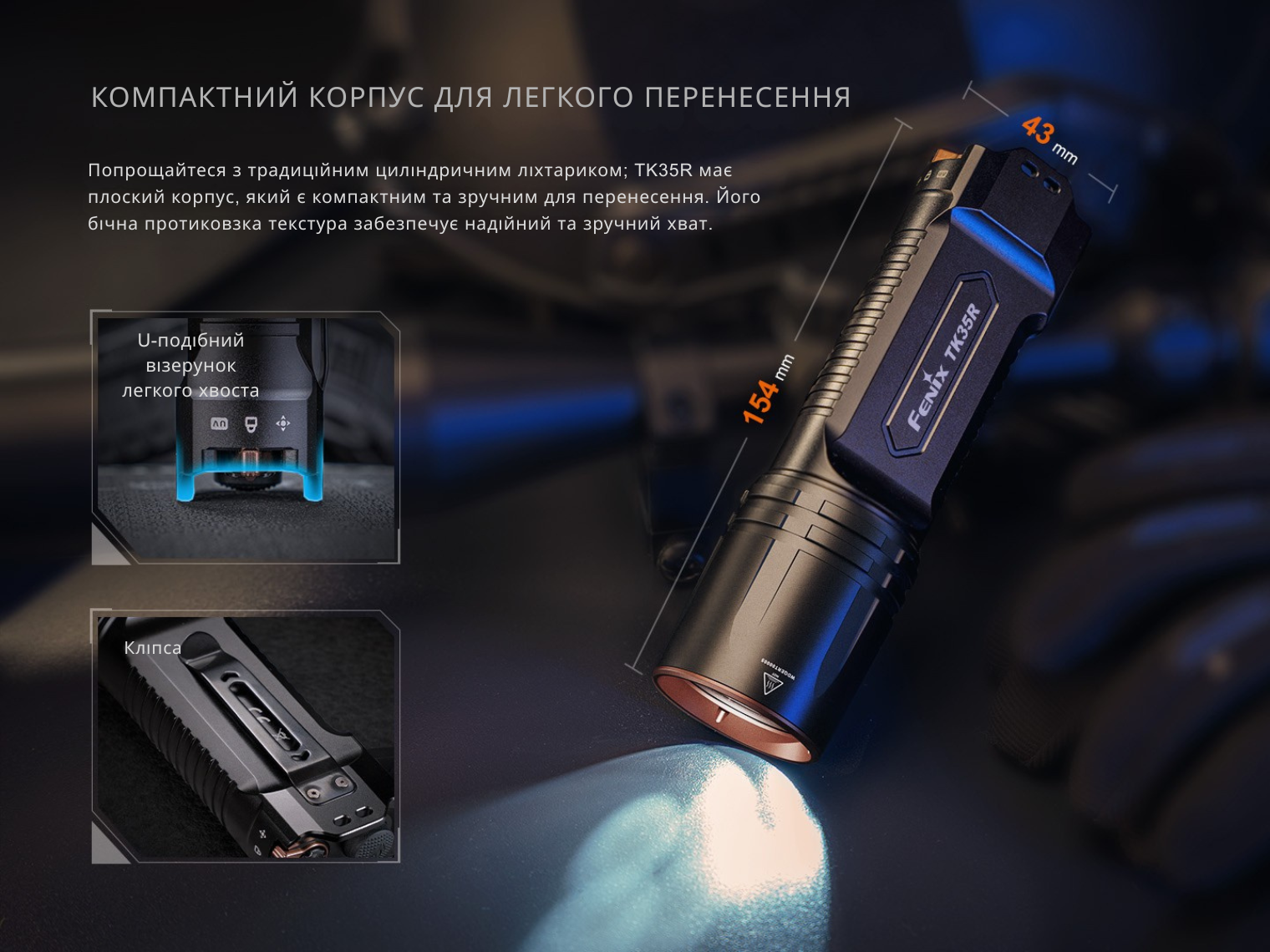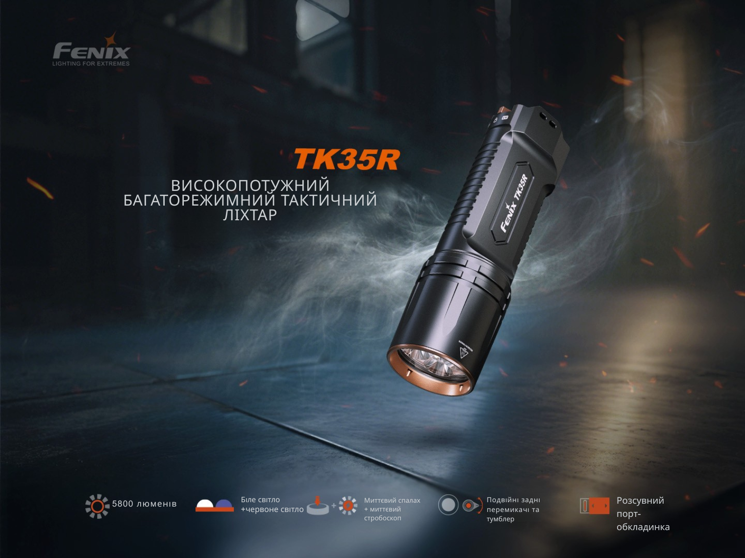 Ліхтар Fenix TK35R — тактична модель для професійного застосування під час патрулювання, пошуково-рятувальних цілей та складних місій просто неба, коли необхідне функціональне, яскраве та особливо міцне джерело світла.