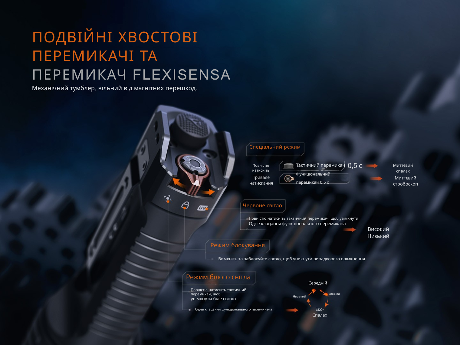 Система управління складається з обертового перемикача FlexiSensa та пари хвостових кнопок з миттєвим доступом до режиму Спалах і миготливого стробоскопа.