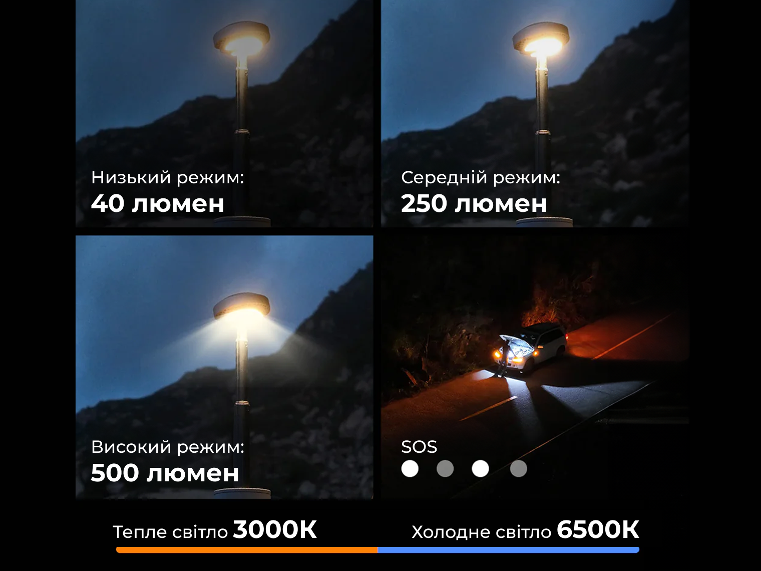 - світловий потік — 40 / 250 / 500 лм;