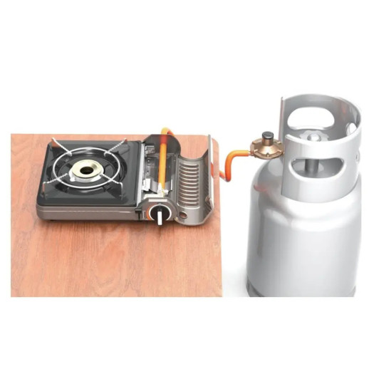 - Два режими роботи: Працює як від цангового газового картриджа 220 г, так і від великого побутового пропанового балона (LPG), що робить плиту універсальною для різних умов використання.