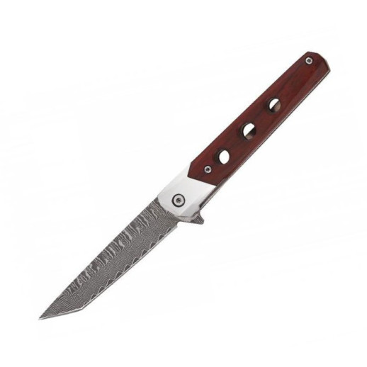 Рукоять ножа відрізняється простою, лаконічною формою, яка відмінно поєднується з тантоїдним клинком. Вона складається з пари полегшених сталевих лайнерів, покритих накладками з червоного дерева. Полегшення в лайнерах виконані наскрізними, від чого рукоять має легкий, «скелетний» вигляд. І це правильне рішення. Хто захоче носити в кишені піджака важке поліно? Джентльменський ніж повинен бути легким.
