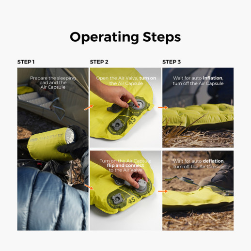 Комплектація | Килимок Tiny Sleeping Pad R05 AVS, мішок для зберігання, насосна капсула AVS, 2 кільця ущільнювачів AVS, 2 ремонтні латки, ремінець для стяжки, кабель для зарядки |