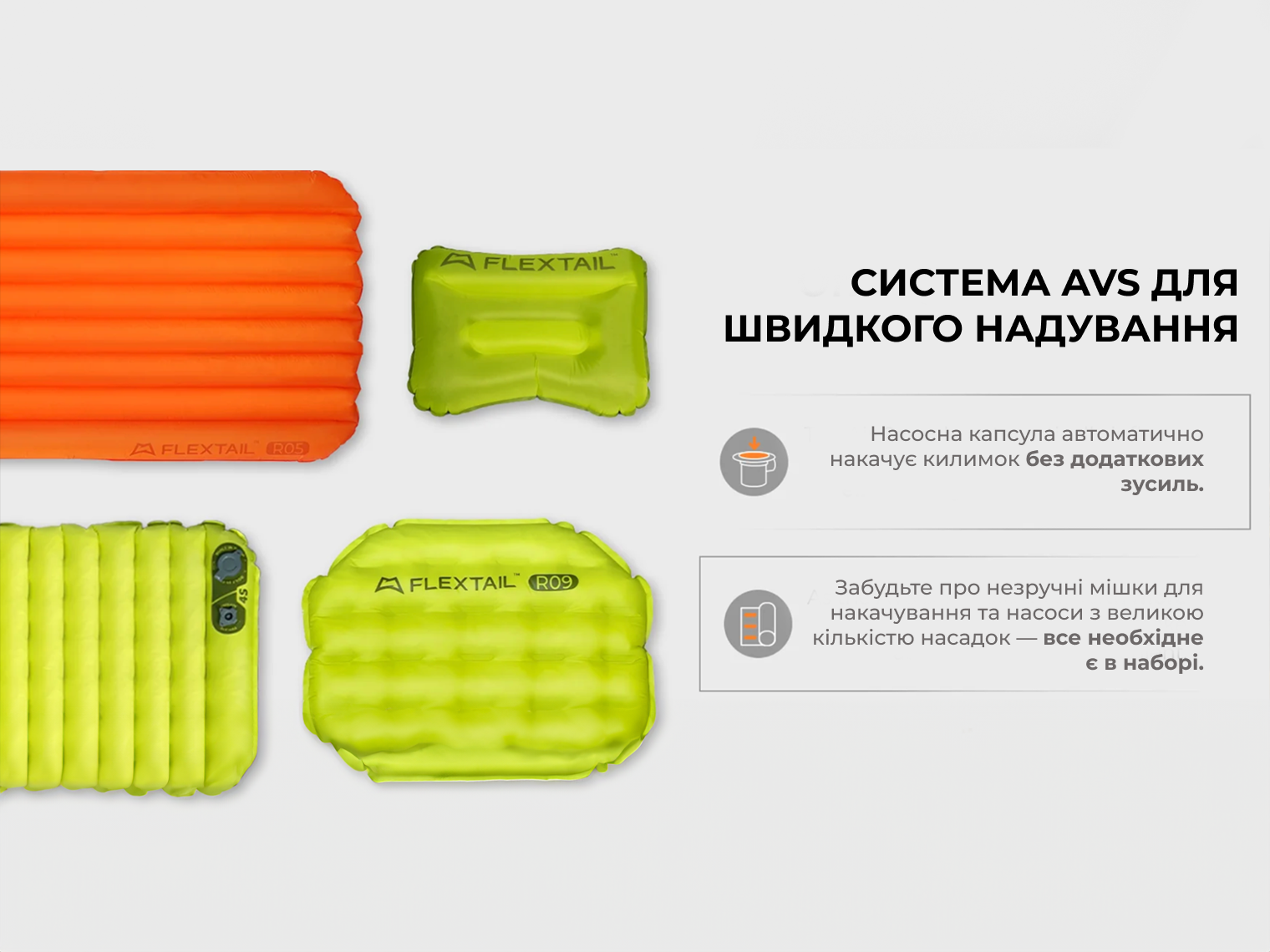 Опис матраса туристичного самонадувного одномісного Flextail R03 AVS Regular надлегкого, 183х65х7 см з насосною капсулою AVS, зелений