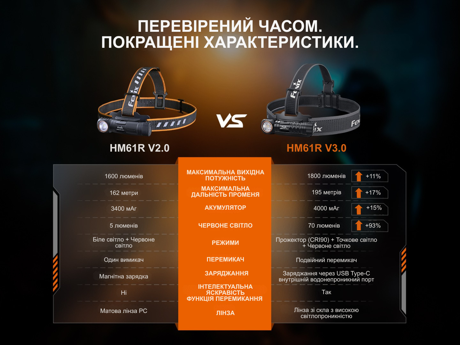 Комплектація | Фонарь Fenix HM61R V3.0, аккумулятор ARB-L18-4000, налобное крепление (холдер и ремешок), зарядный кабель USB Type-C, запасное уплотнительное кольцо, инструкция |