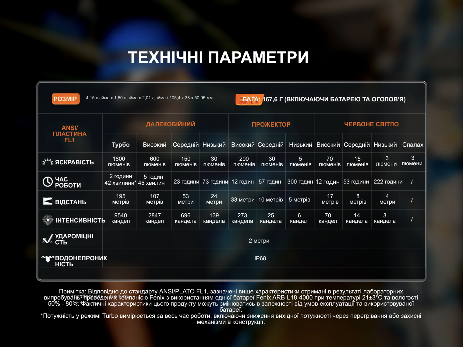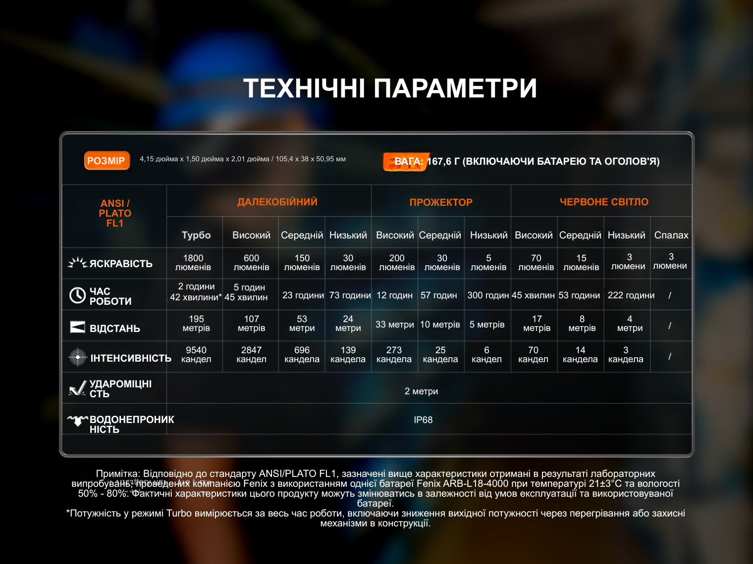 - Турбо: 1800 лм – 9540 кд – 2 год 42 хв – 195 м;