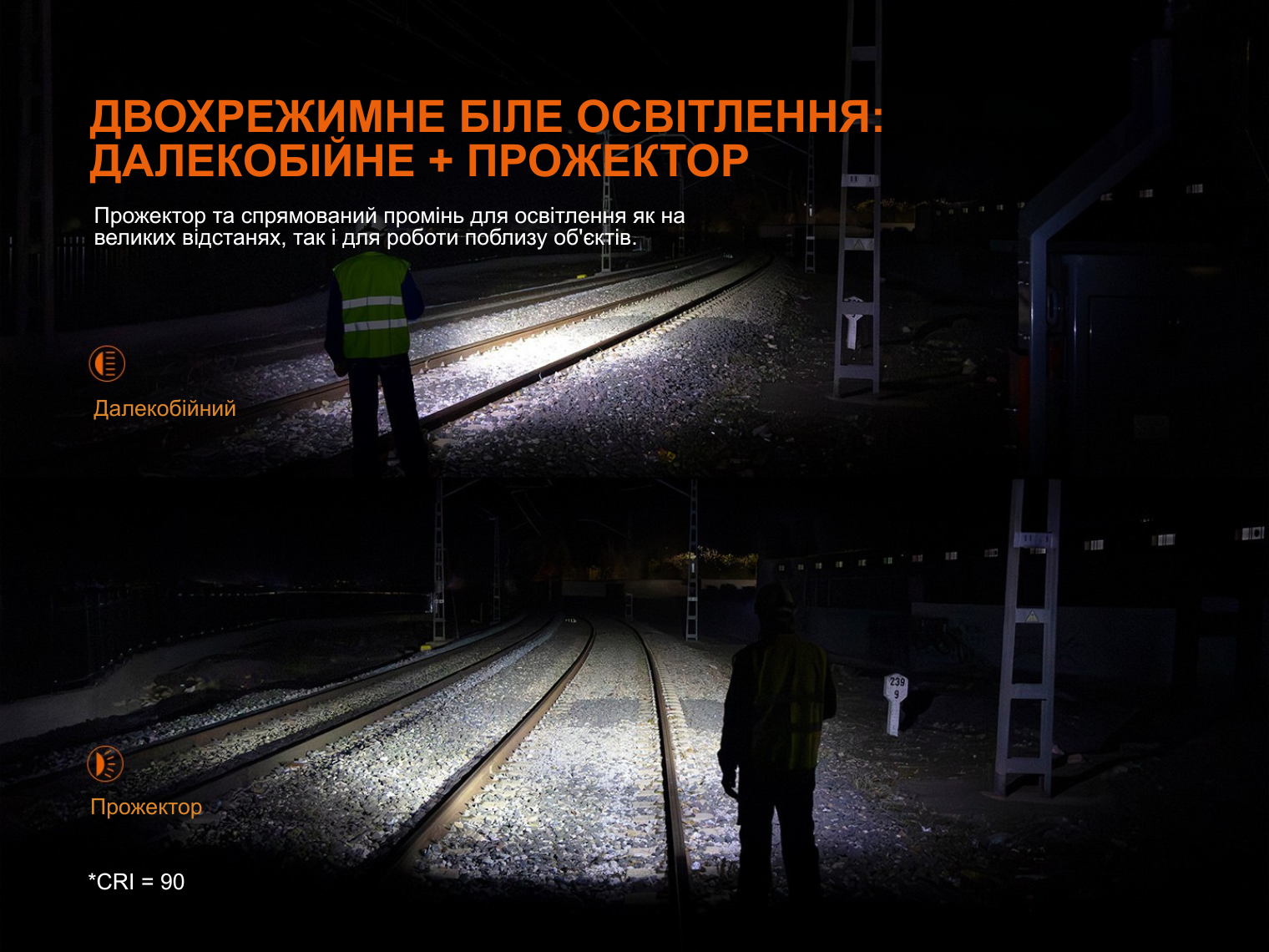 Основний світлодіод Luminus SST40-GEN2 видає холодне біле світло (6500K) і розрахований на дистанції до 195 м. Для роботи з документами або поблизу додано діод OSRAM 1414 CRI90, який дає нейтральне розсіяне світло без спотворення кольорів. Окремий червоний діод OSRAM 1414 яскравістю до 70 люмен дозволяє зберегти нічний зір або працювати в режимі сигнального маяка.