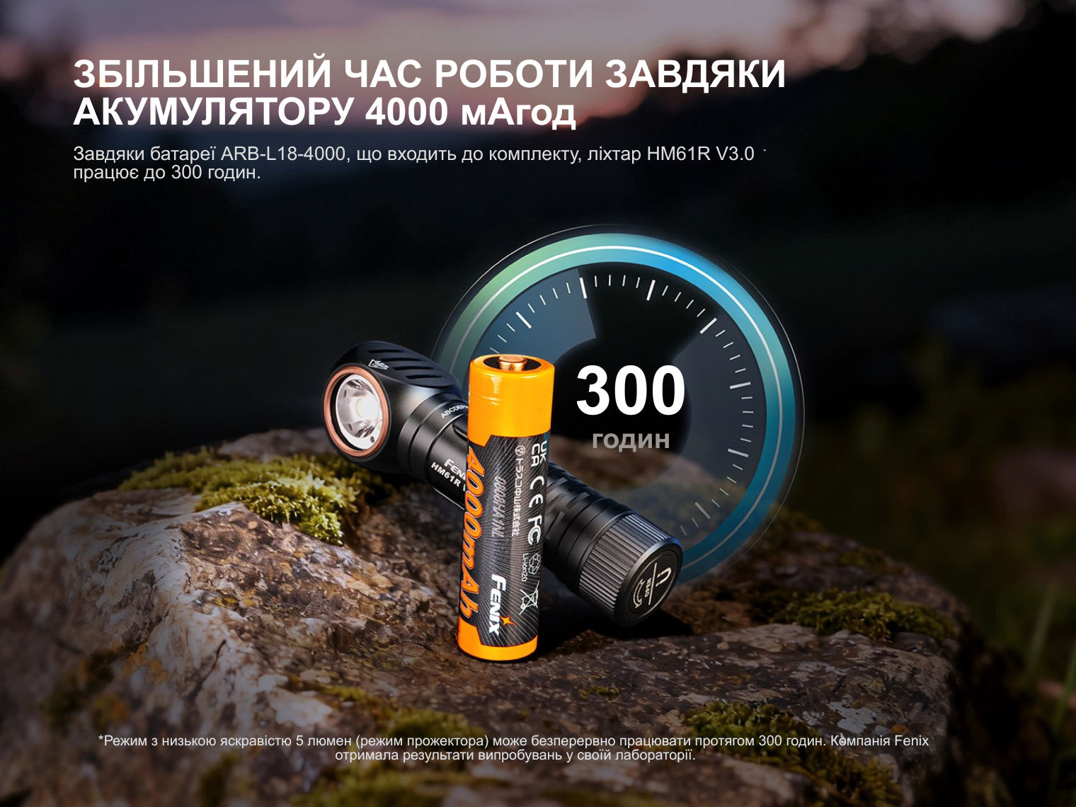 Ліхтар Fenix HM61R V3.0, акумулятор ARB-L18-4000, наголовне кріплення (холдер та ремінець), зарядний кабель USB Type-C, запасне ущільнювальне кільце, інструкція користувача, гарантійний талон.