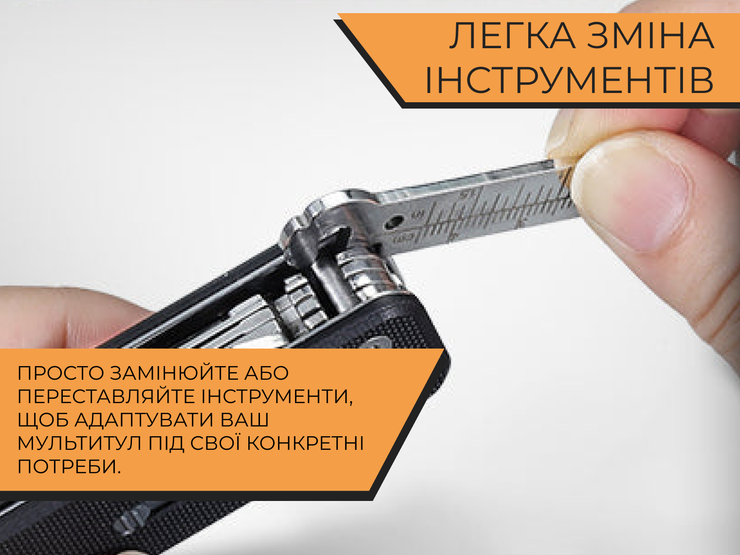 Інструмент | Крестовая отвертка, Зубочистка + пинцет, Ножницы, Открывалка для бутылок и консервных банок, Канцелярский нож, Обычный нож с прямой заточкой, Напильник + линейка + плоская отвертка, Зажим для крепления на ремне или кармане |
