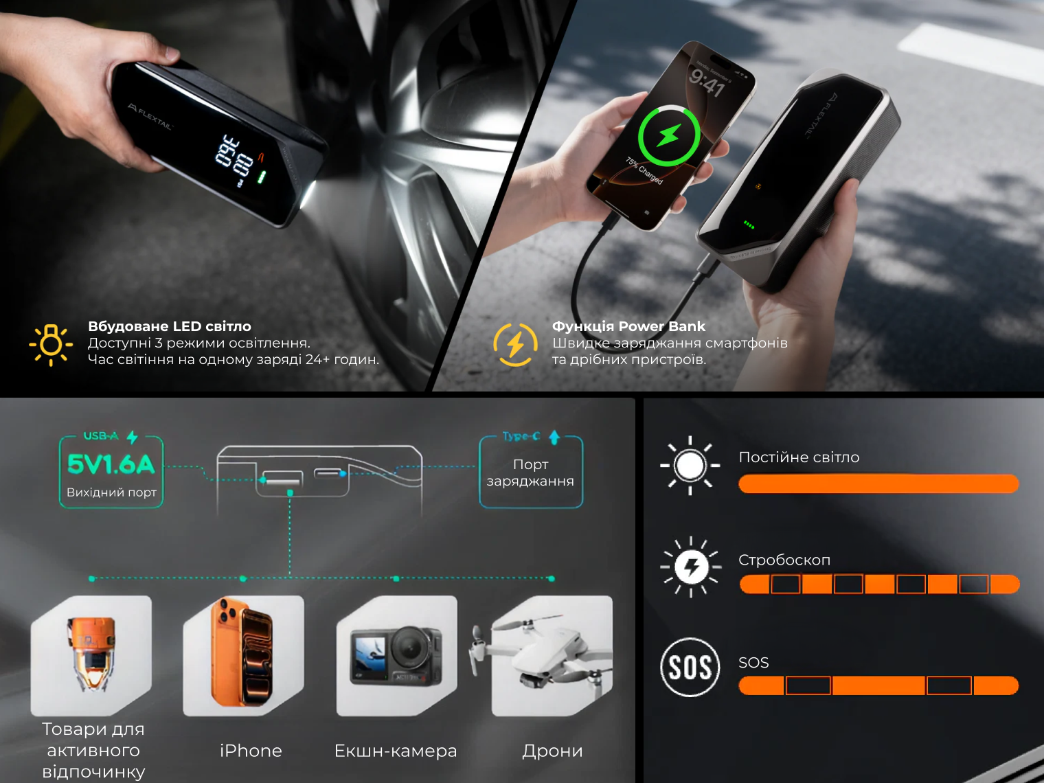 Опис насоса-ліхтаря-powerbank автомобільного Flextail Evo Tire Pump, 150 PSI, 2000 mAh:
