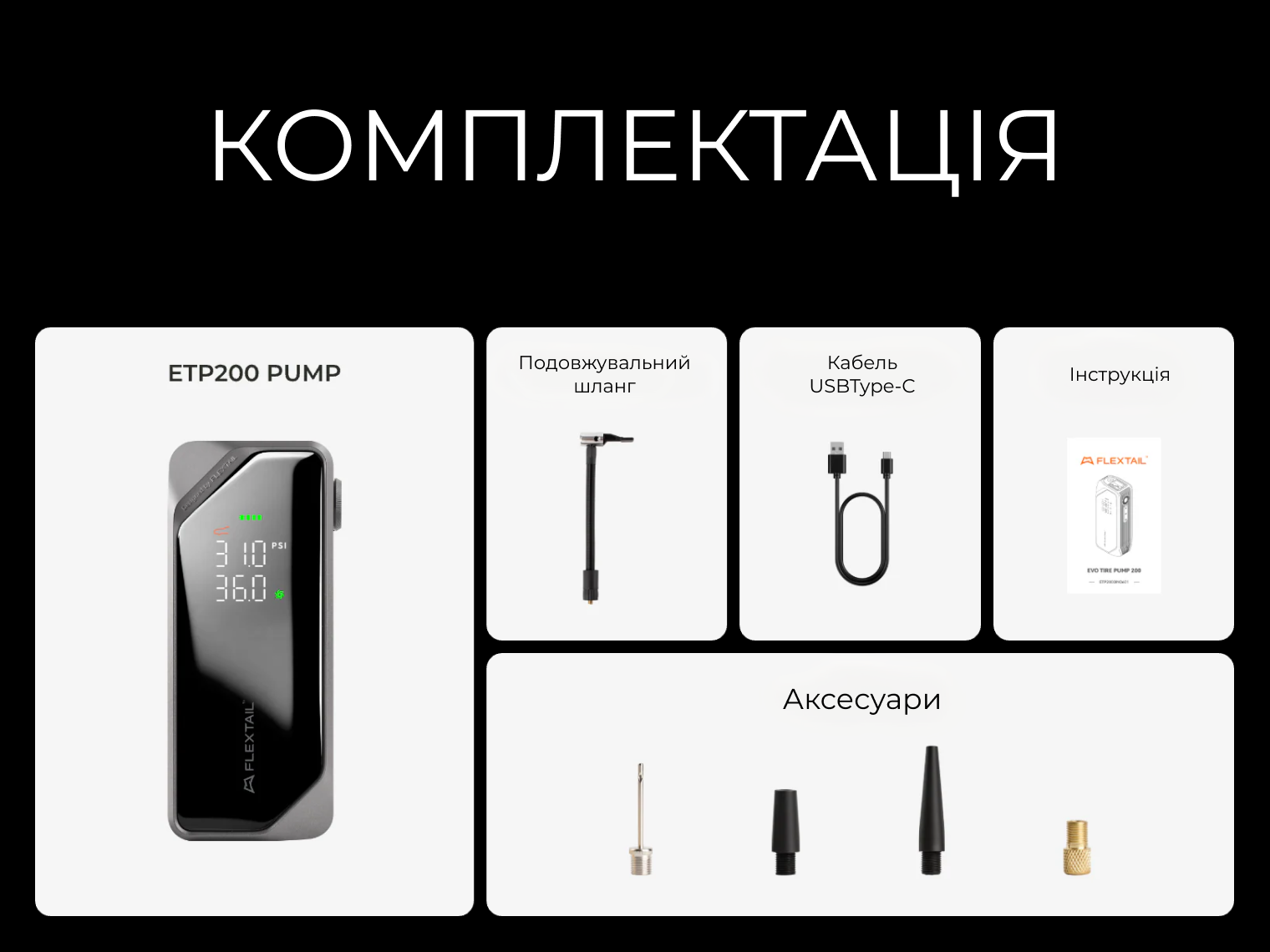 Комплектація | Насос ETP200, удлинительный воздушный шланг, набор универсальных насадок-переходников, кабель USB Type-C, инструкция |
