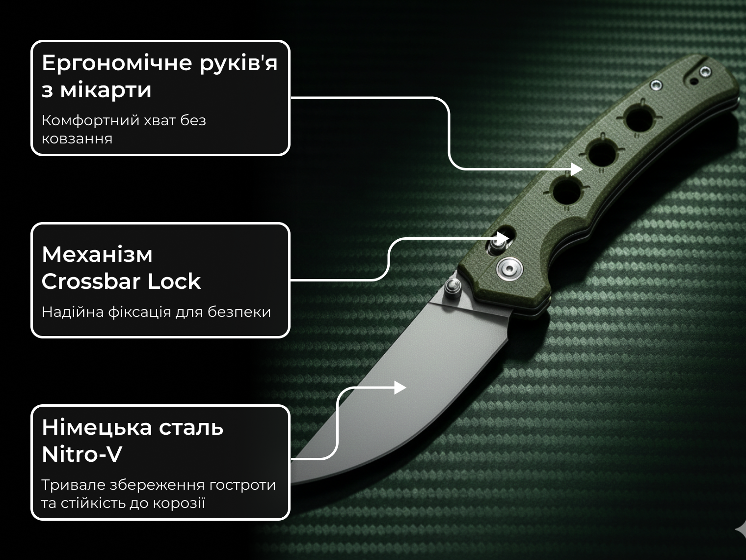 - матеріал клинка – сталь Nitro-V (твердість 59–61 HRC);