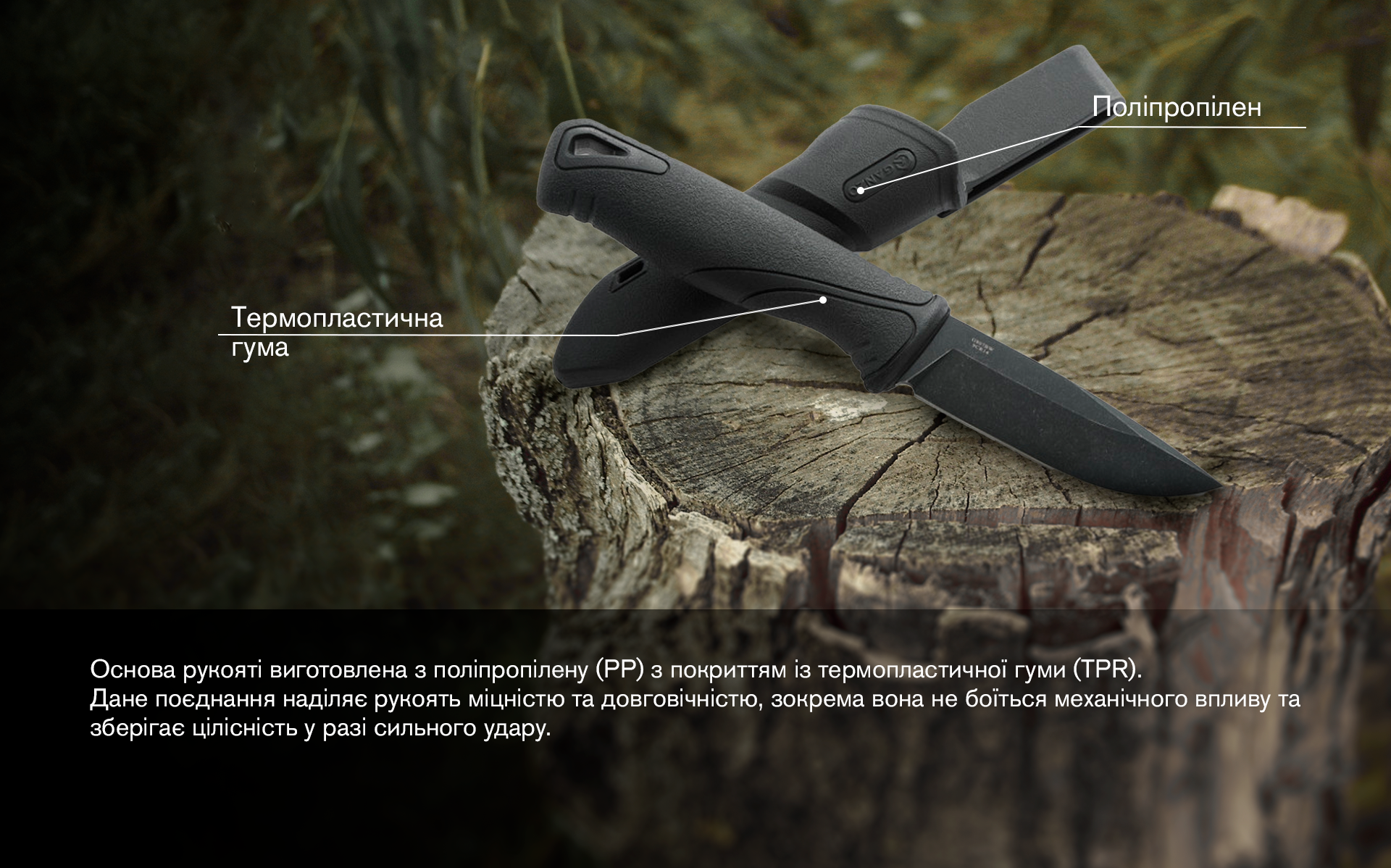 - Руківʼя з PP+TPR. Жорстка основа з поліпропілену (PP) відрізняється стабільністю під час впливу зовнішніх факторів: вологи, хімії, різких температурних перепадів. Зверху є чіпкий шар з термопластичної гуми (TPR), який мінімізує ковзання долоні по руківʼю.
