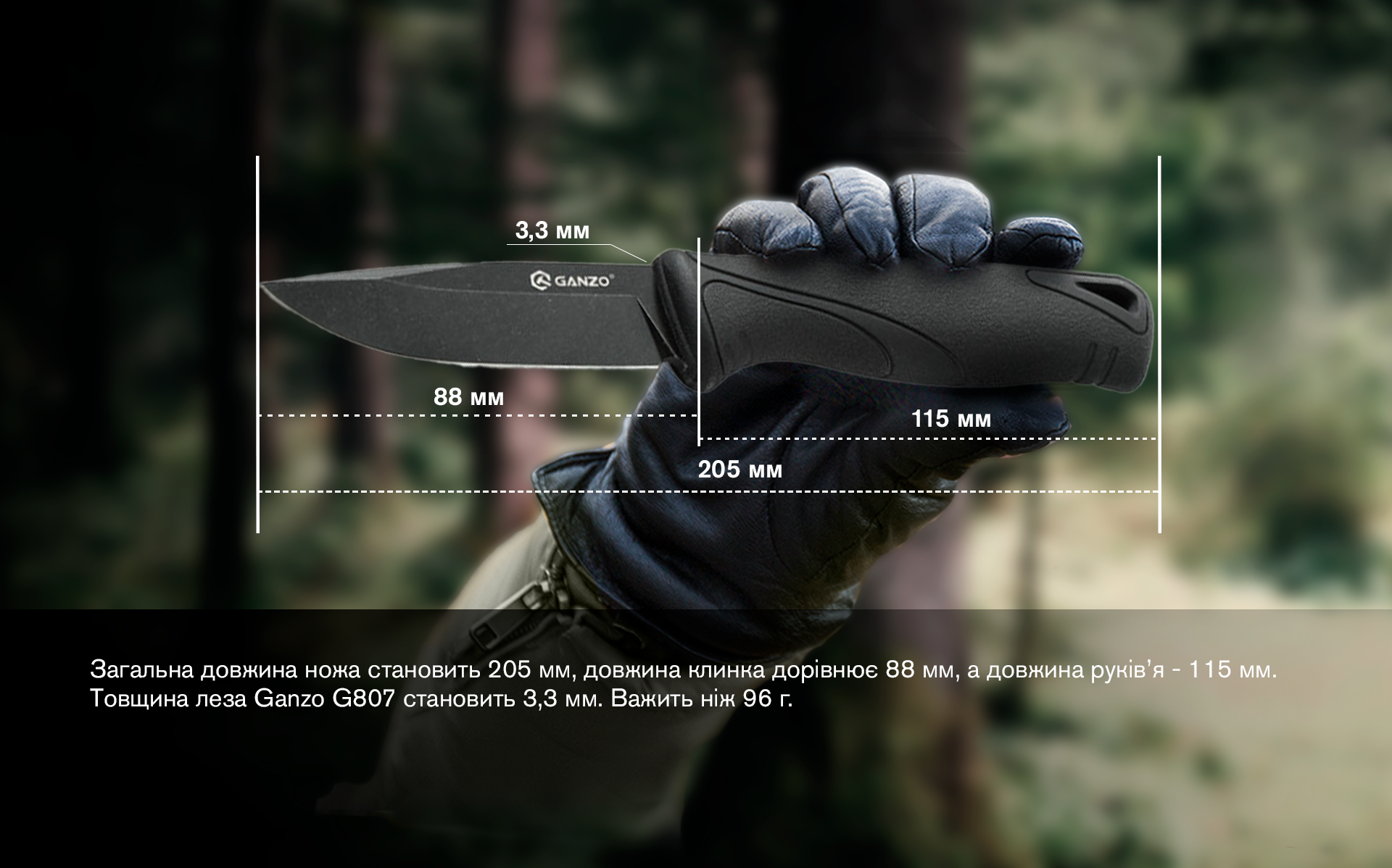 У хвостовій частині руківʼя передбачено отвір для темляка. При повній довжині 205 мм Ganzo G807BW важить лише 96 г — це наднизьке значення з урахуванням повноформатних розмірів моделі.
