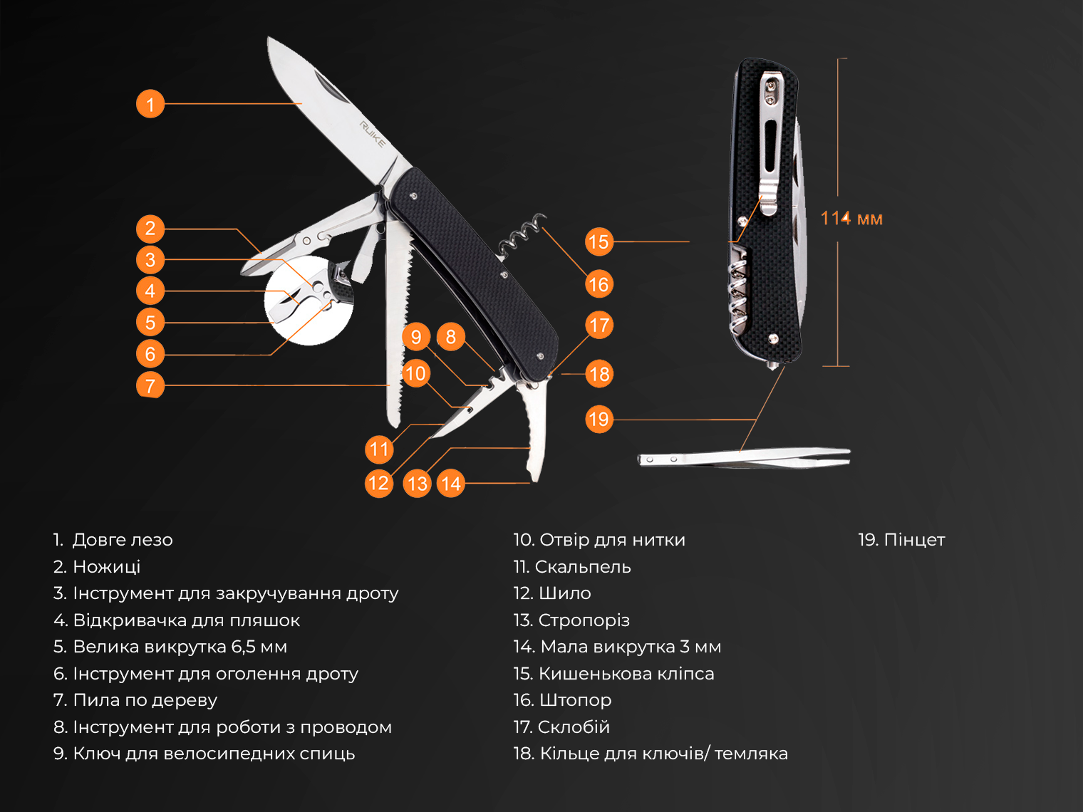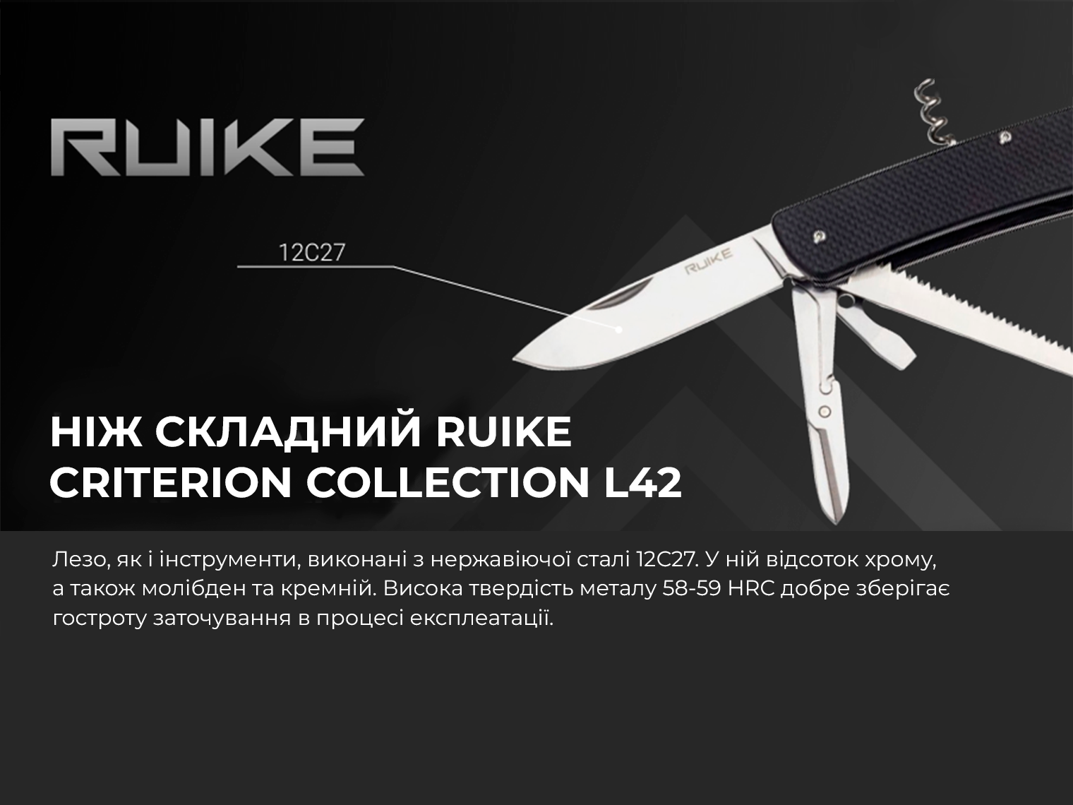 Не менш важливу функцію ніж ніж, грають і інші інструменти, вбудовані в Ruike L42. В нижній частині рукоятки розміщені пила по дереву, зменшені в розмірі ножиці, шило, дві прямі Викрутки (мала і Середня), стропоріз, відкривачку для пляшок, інструмент, що зачищає дроти від ізоляції. Зі зворотного боку рукоятки можна дістати штопор. Ще два інструменти поміщені з боку торця-це склобій і невеликий кільце для підвішування до ножу темляка.