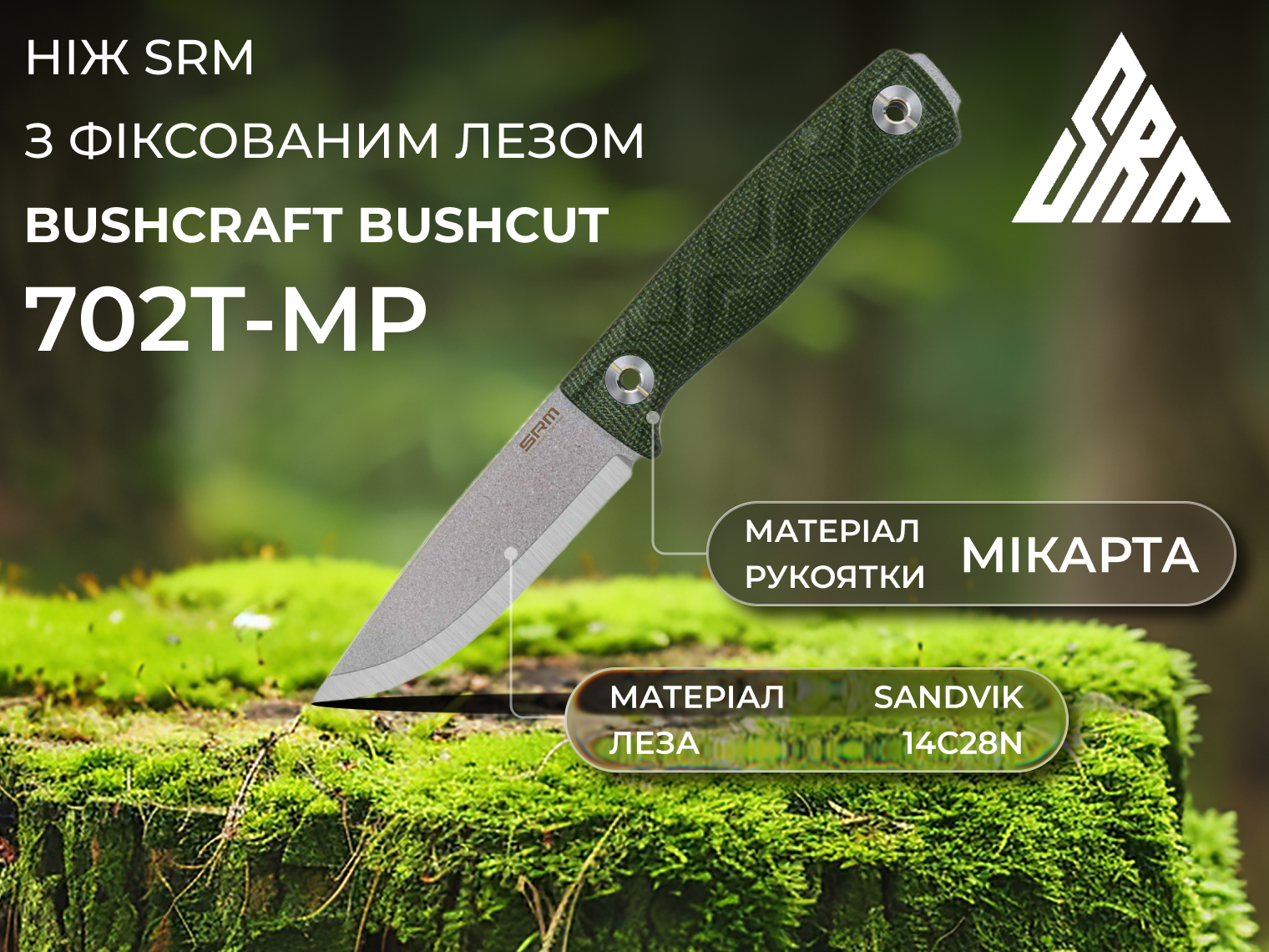 Фіксований ніж SRM 702T-MP створений для завдань на відкритому повітрі: бушкрафт, туризм, робота по дереву та силове різання щільних матеріалів. Цілісна конструкція має передбачувану жорсткість і витривалість, тому інструмент витримує високі навантаження, зокрема при поперечних зусиллях.