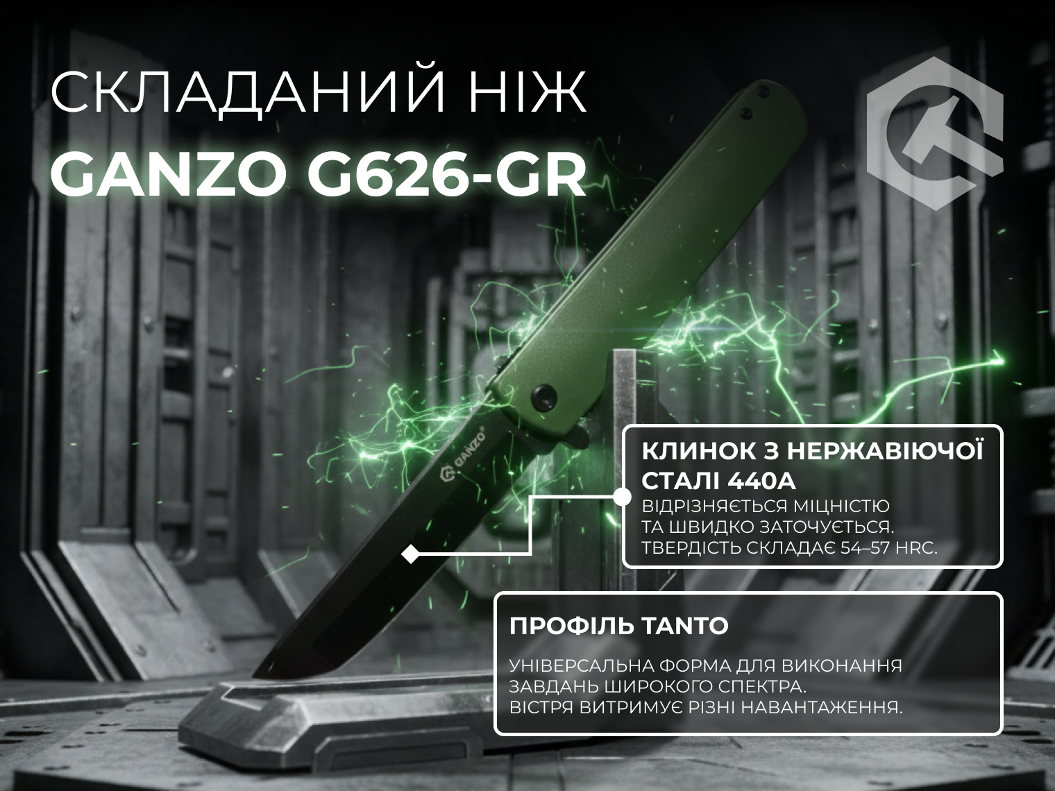 Модель Ganzo G626-GR орієнтована на щоденне використання в місті та виїзди на природу. Головна особливість ножа — клинок Tanto завдовжки 96 мм з двома різальними кромками, що сходяться під кутом. Товсте вістря витримує сильні навантаження, тому кінчик не зламається навіть під час пробивання пластику чи товстого картону.