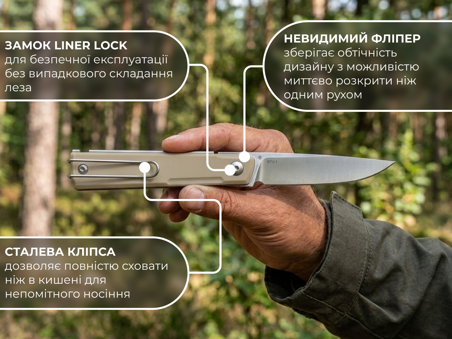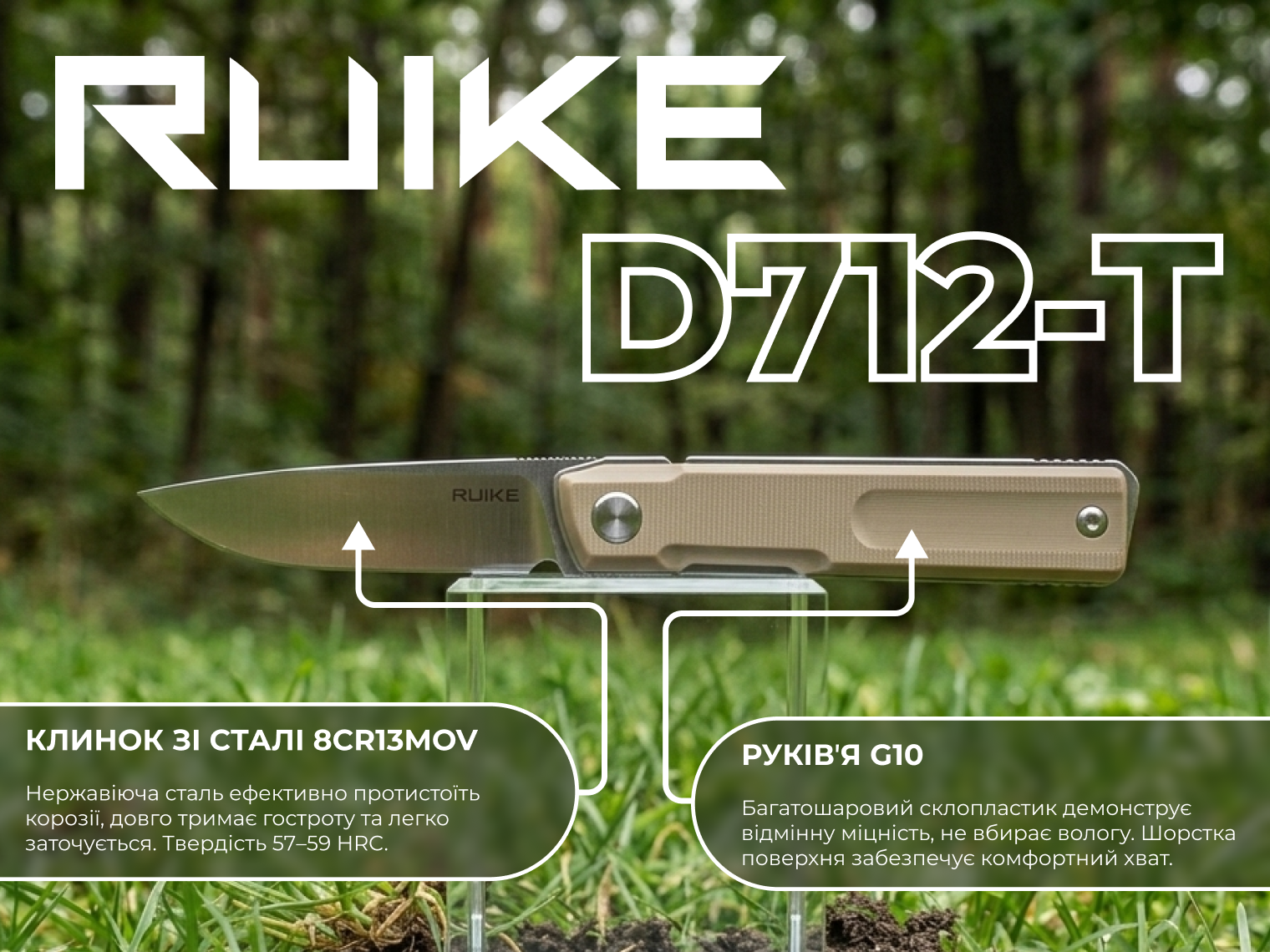 Ruike D712-W розроблений як надійний інструмент для щоденних завдань, де важлива простота та ефективність. У конструкції ножа немає складних чи декоративних елементів, які могли б забиватися брудом або виходити з ладу.