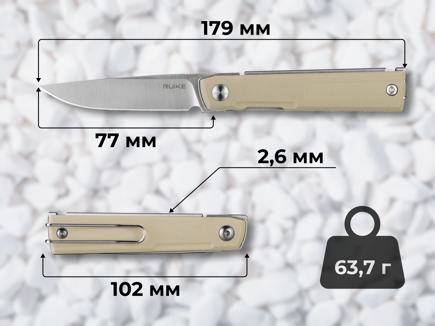 - матеріал руківʼя — G10 білого кольору;