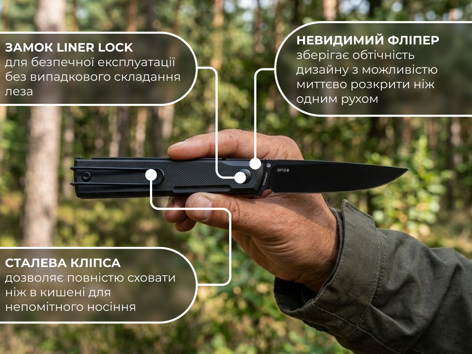 Чорний колір клинка, руківʼя та навіть дрібних деталей (гвинтів та кліпси) робить ніж непомітним та стриманим. Він не привертає зайвої уваги та виглядає як стильний аксесуар.