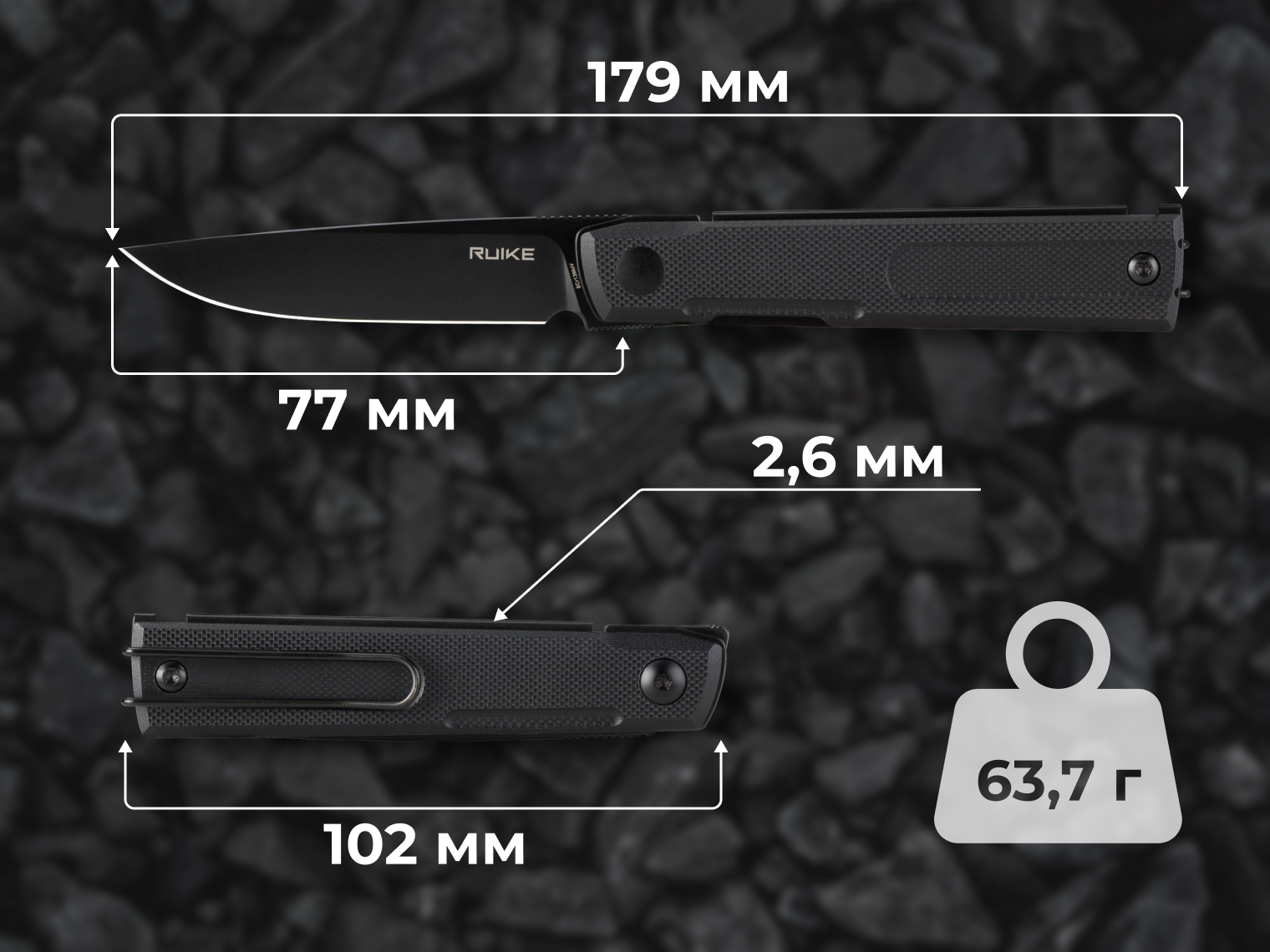 - матеріал руківʼя — G10 чорного кольору;