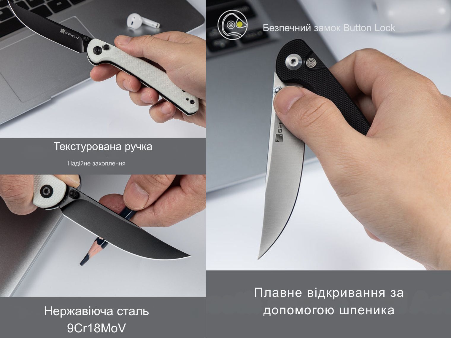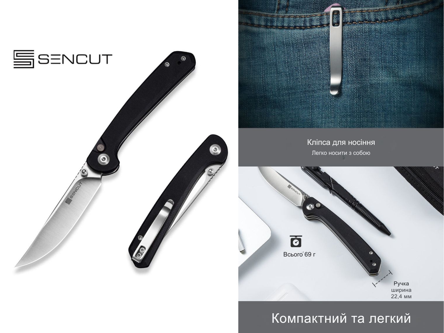 Ніж Sencut Skelfin S25007-3 має компактний складаний формат, адаптований під повсякденне носіння в кишені, на сумці або на амуніції. Двопозиційна кліпса з нержавіючої сталі збільшує кількість способів носіння — затискач переставляється під праву або ліву руку, тому ви можете підлаштовувати його положення під свої потреби.