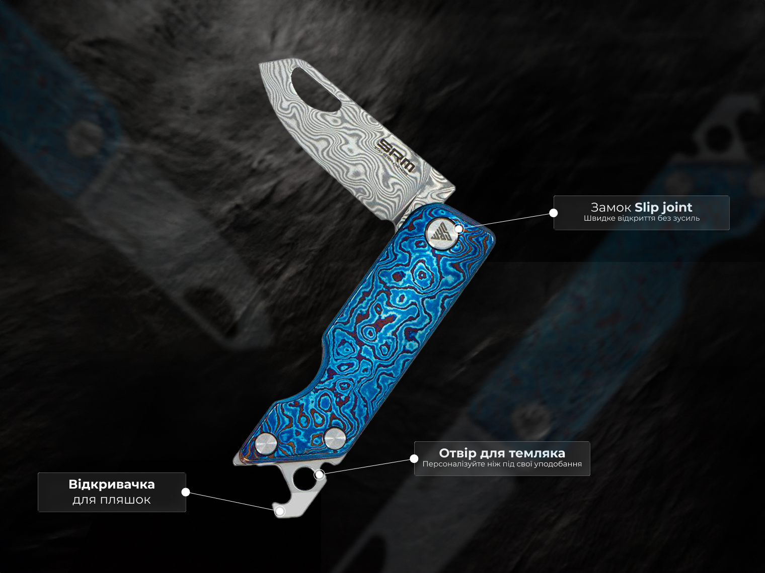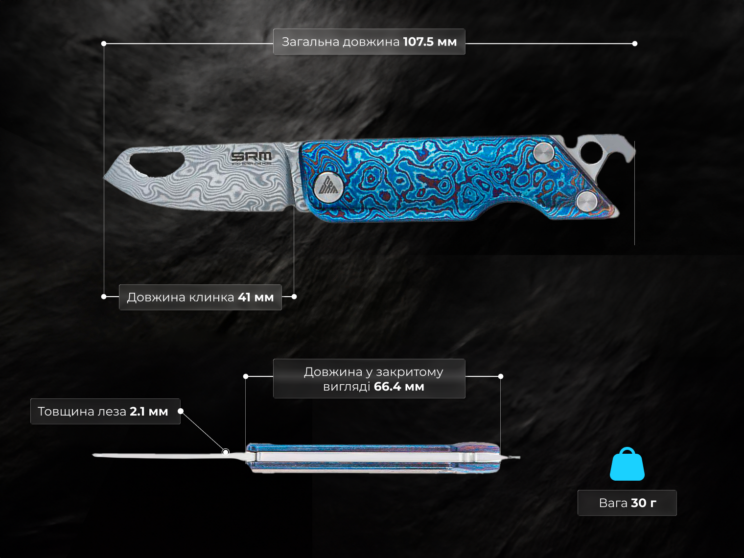 Опис ножа складаного кишенькового SRM 6435, (4.1 см) Damascus / Titanium блакитний: