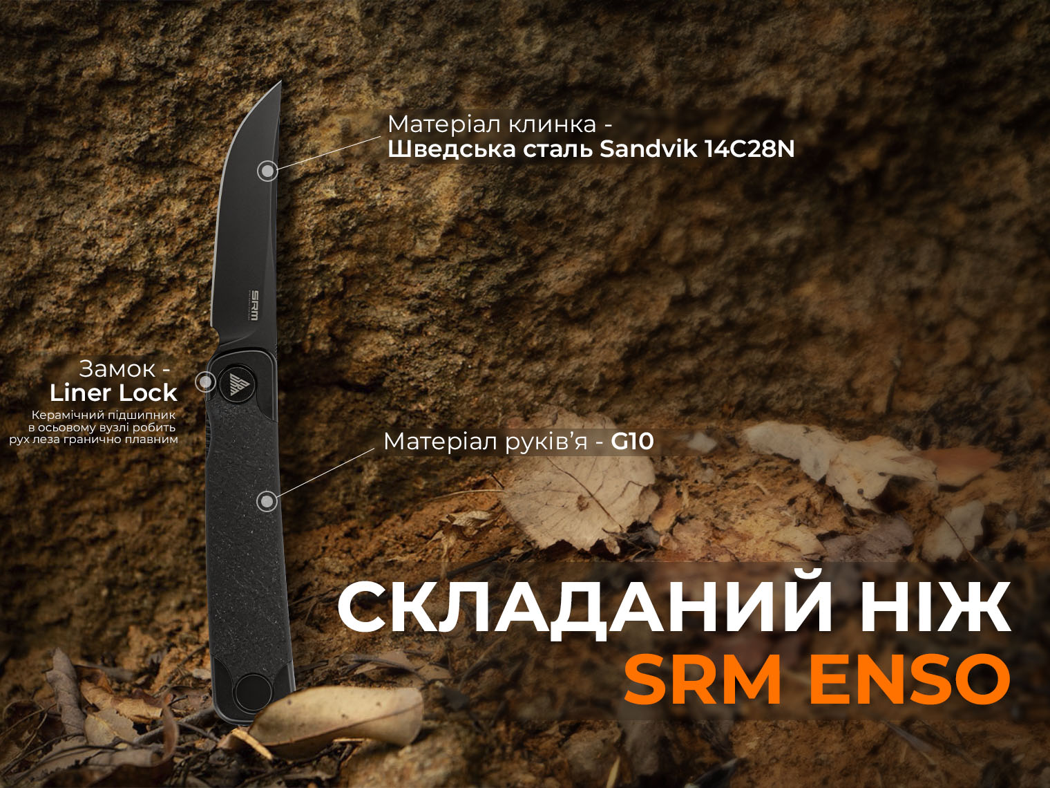 Серія SRM Enso включає складані ножі для повсякденного носіння, які адаптовані для виконання базових завдань. У конструкції поєднуються мінімальна вага (лише 81 г) та вивірена ергономіка, що розподіляє навантаження по всій долоні, знижуючи відчуття втоми.