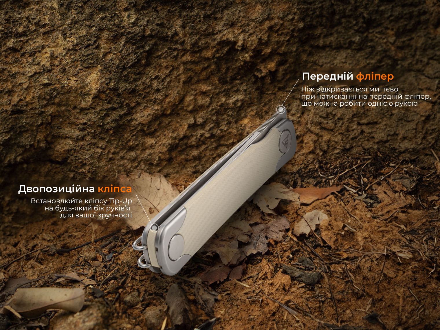Клинок Clip Point з піднятим гострим кінчиком підходить для проколювання та контрольованого різання. Водночас ніж розрахований не лише на делікатну, а й на силову роботу — для цього на обуху передбачено упор для великого пальця, що дозволяє краще контролювати лезо.
