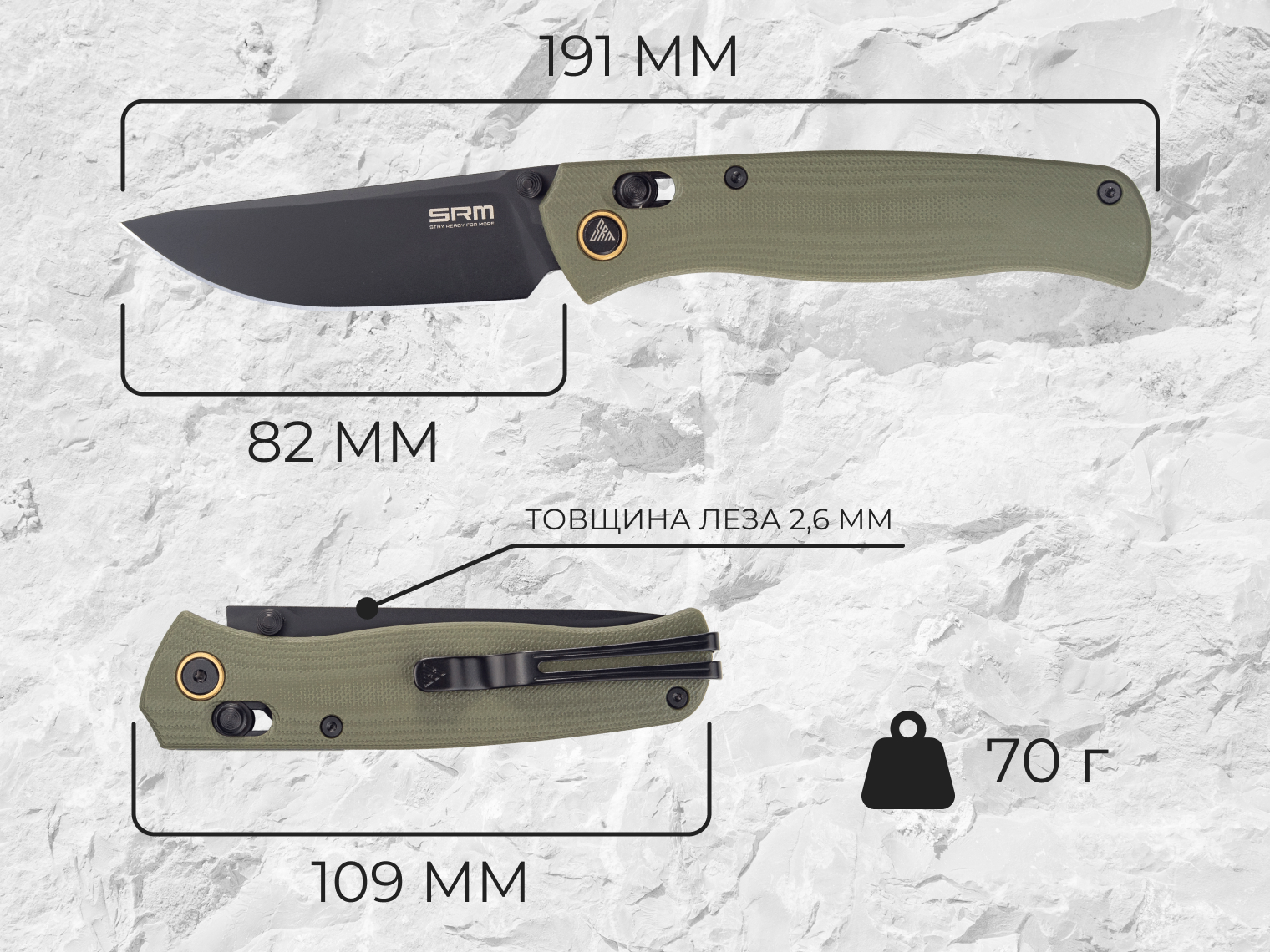 Загальна довжина при відкритті 191 мм з довжиною клинка 82 мм дає відмінний баланс між контролем і якістю різання. Товщина 2.6 мм в обуху робить клинок стійким до деформацій у разі високих навантажень.