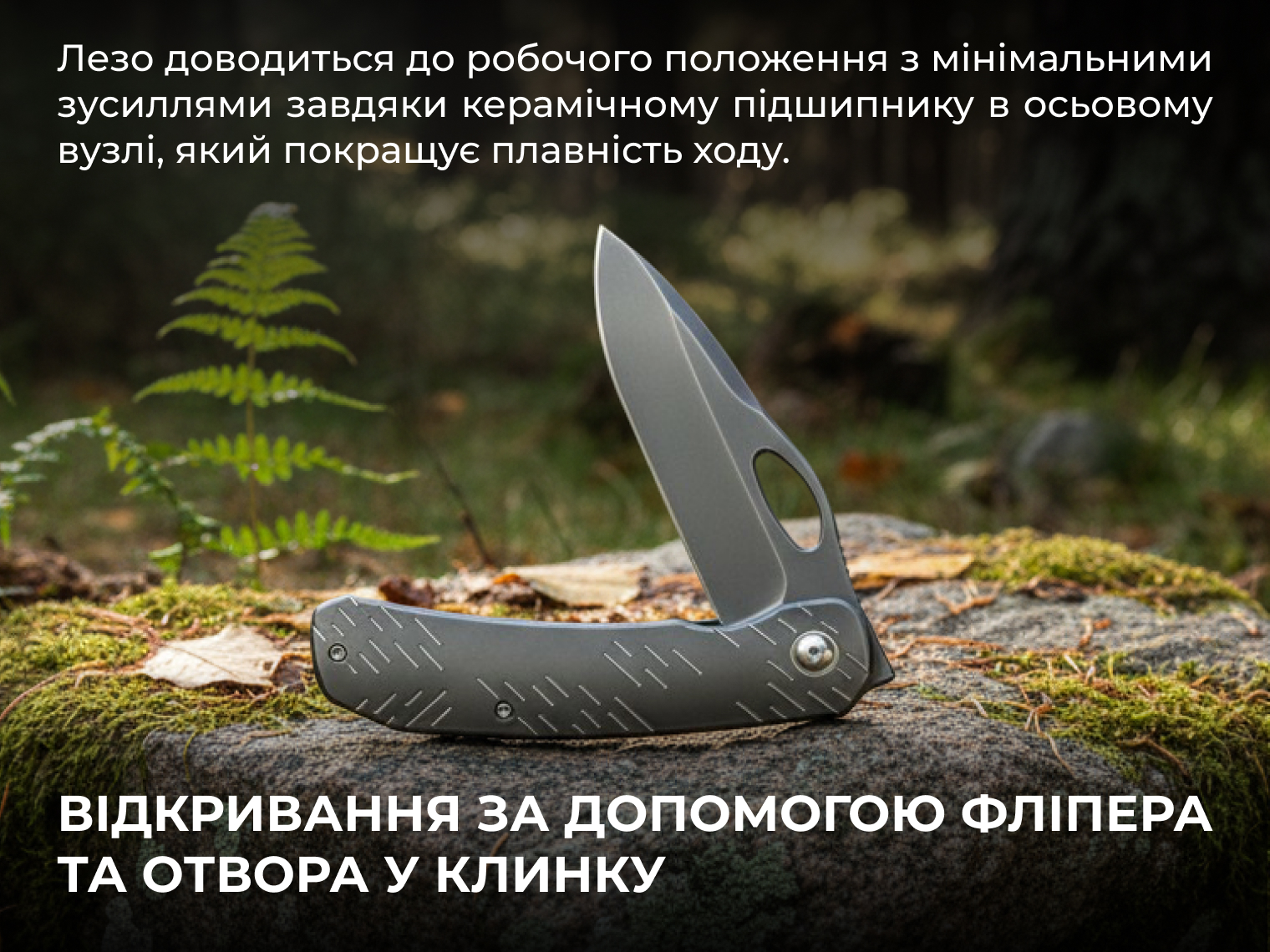 - спосіб відкриття ножа – передній фліпер, отвір у клинку;