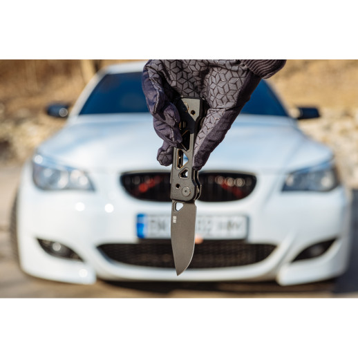 Клинок Drop Point оброблений методом галтування та доповнений чорним покриттям для маскування дрібних подряпин і відбитків пальців. Щоб відкрити ніж, слід підчепити клинок пальцем за трикутний отвір біля обуха. Маніпуляцію легко проводити як правою, так і лівою рукою, адаптуючи під індивідуальний стиль використання. Керамічні підшипники в осьовому вузлі відповідають за плавну роботу механізму відкриття.