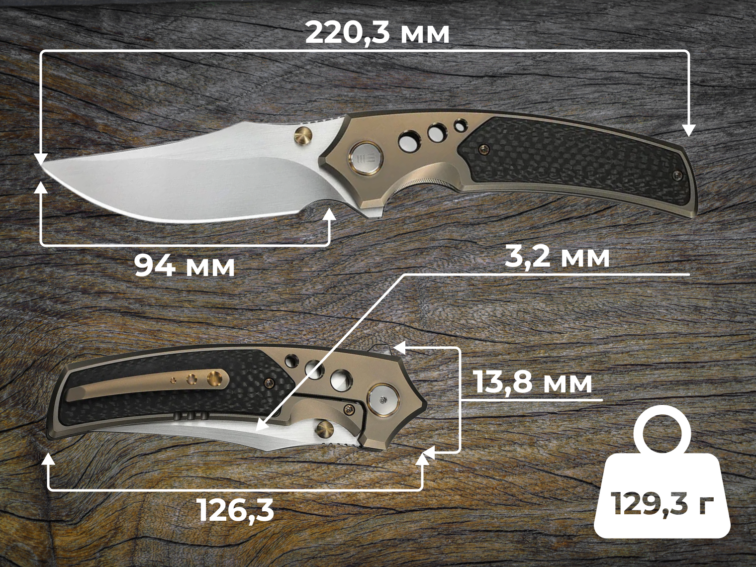 Повна довжина ножа у відкритому стані — 220,3 мм. Уся фурнітура, включаючи гвинти, кліпсу та шпеньок, також виготовлена з титану з золотистим акцентом, що підкреслює преміальний статус моделі. Обертова система осьового вузла та витончена кліпса дозволяють комфортно носити ніж на кишені, роблячи його майже невідчутним завдяки вазі у 129,3 г.