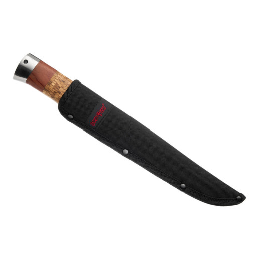 У комплекті з ножем ідуть міцні піхви з кордури. Широка шльовка дозволяє підвісити їх навіть на дуже широкий ремінь брюк.