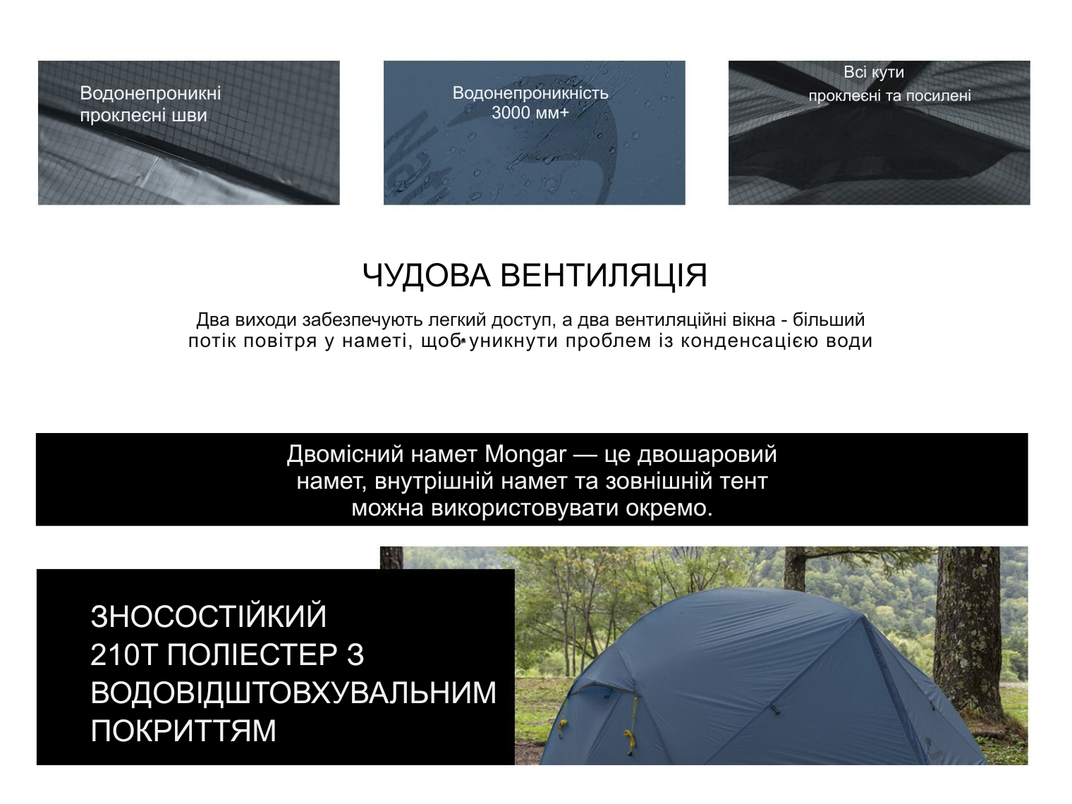 Зовнішній тент | поліестер 210T з PU-покриттям (3000 мм вод. ст.) |