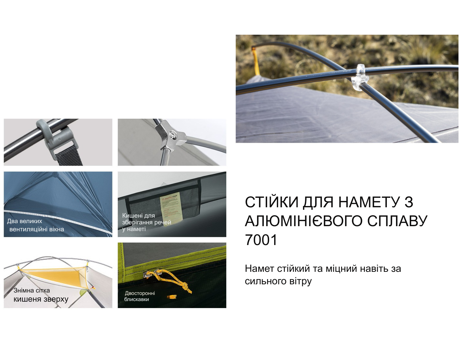 - Дуги каркаса з алюмінію 7001. Сплав не піддається іржі та механічним ушкодженням, а його гнучкість дозволяє зберігати цілісність навіть у разі різких навантажень під час поривів вітру.