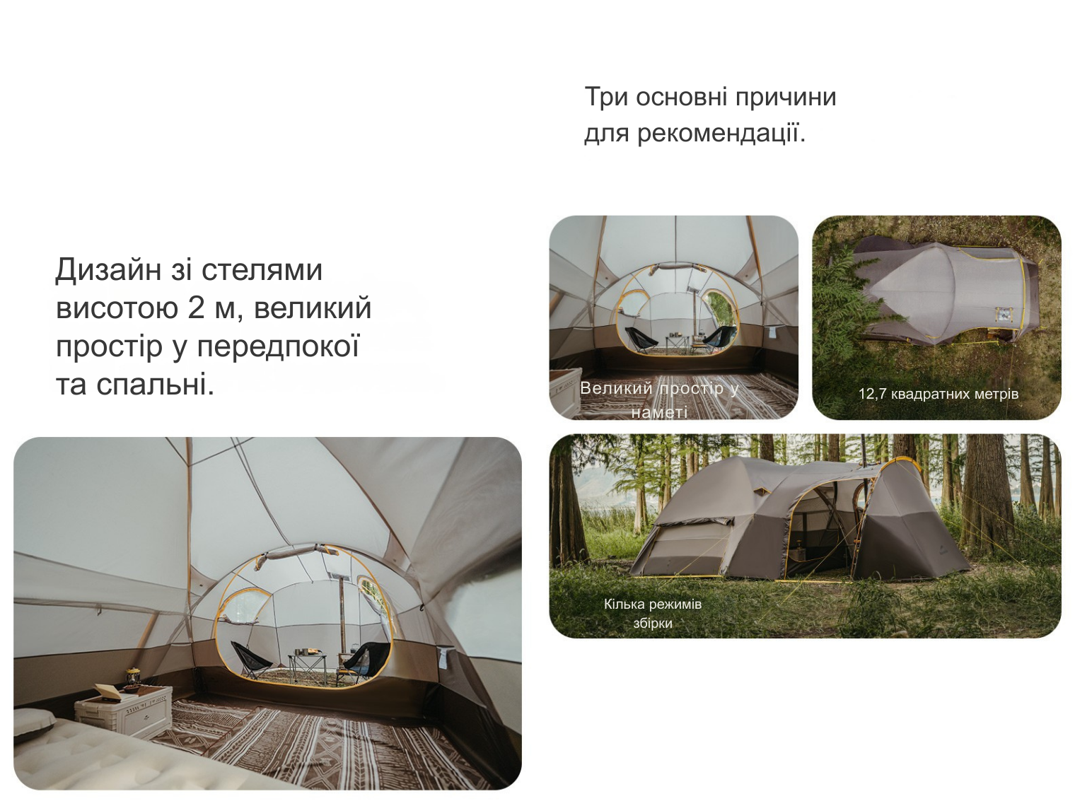 Площа внутрішнього простору сягає 12.7 м², тому намет оптимальний для сну 6 осіб та навіть може вмістити 8 відпочивальників для спільної вечері та вечірки великою компанією.