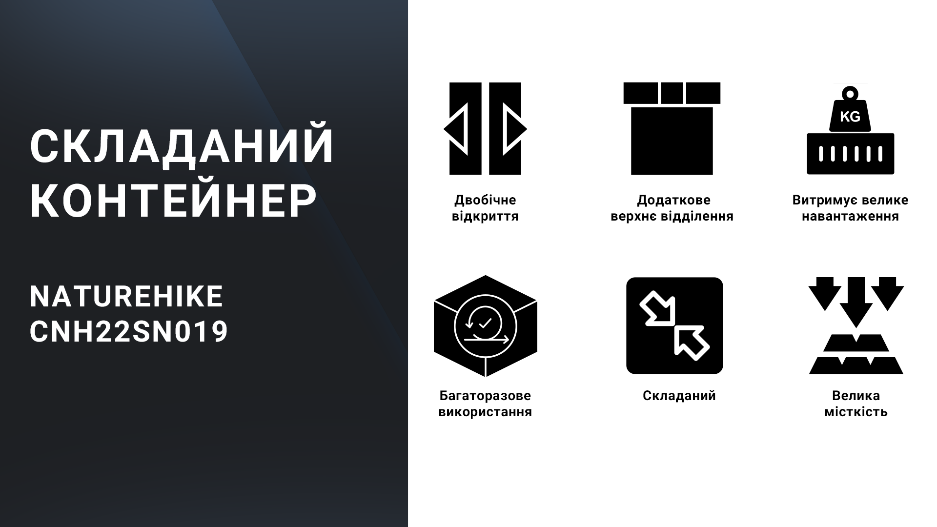 Контейнер CNH22SN019 дозволяє з комфортом облаштувати місце для заміського відпочинку, забезпечуючи зручне зберігання спорядження або харчових продуктів. Конструкцію також можна використовувати як імпровізований столик або тумбу.