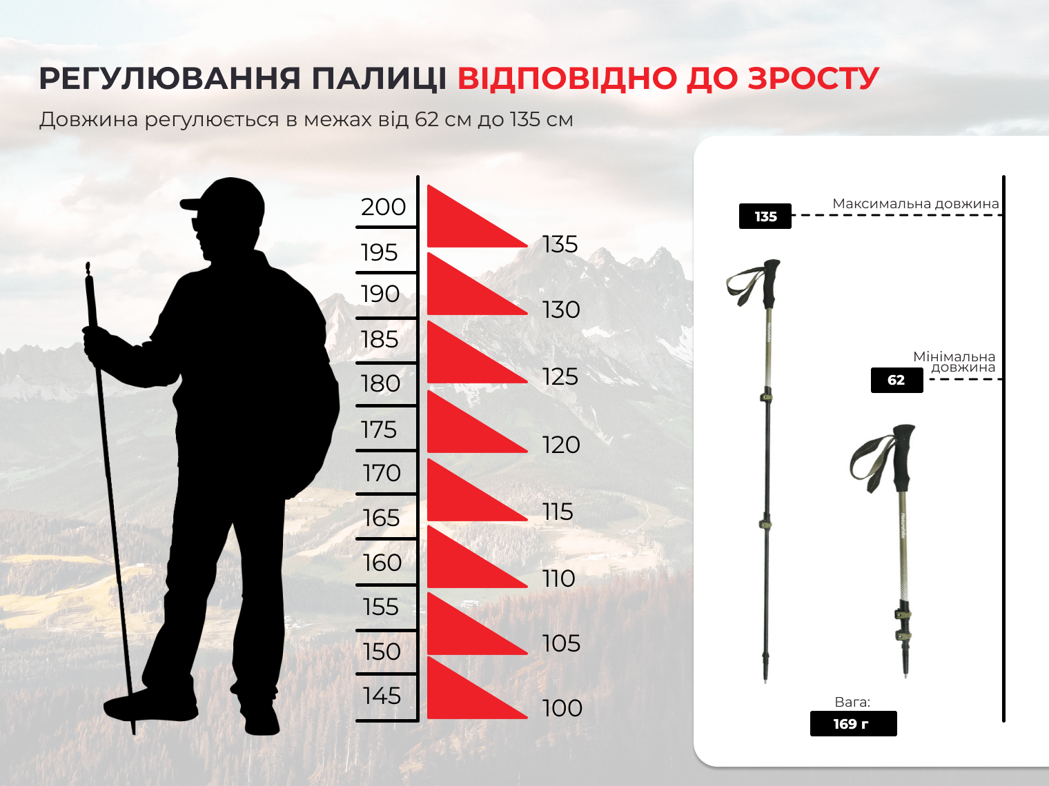 До комплекту входить трекінгова палиця вагою 135 грамів, а також включає насадку для ходьби по твердих поверхнях та кільце для пересування по піску.