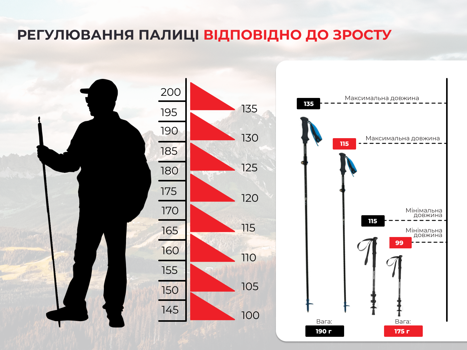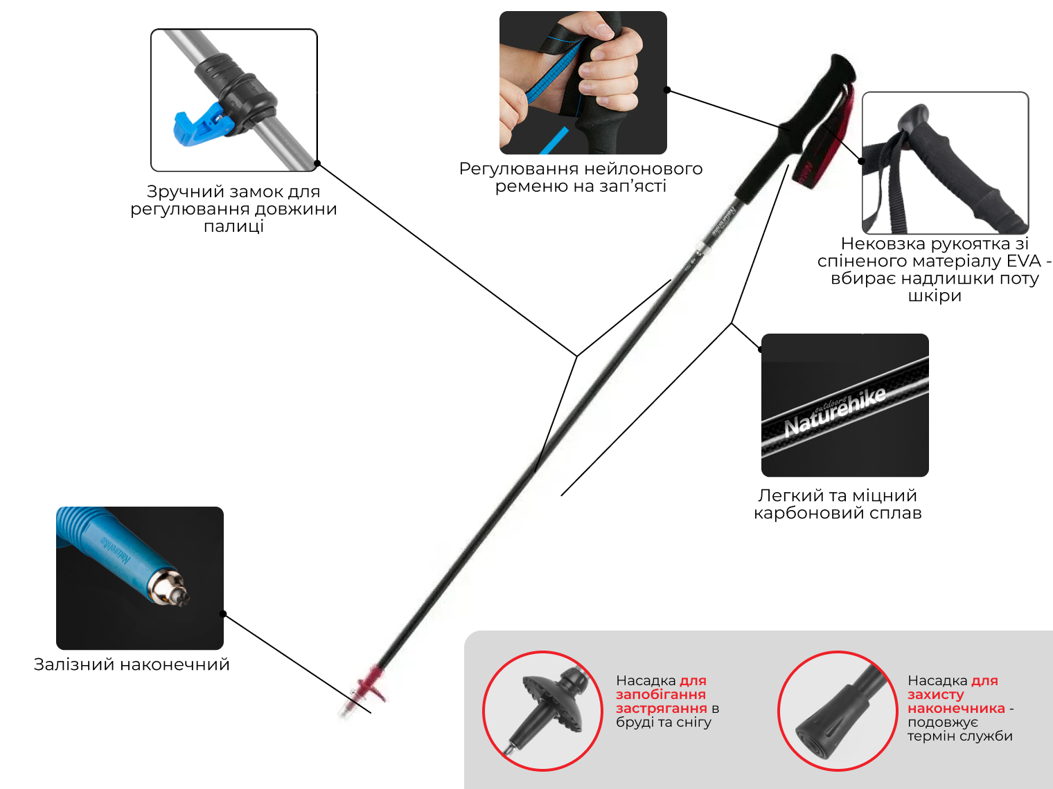 Внизу палиць інтегровані міцні наконечники з вольфраму. Вони відповідають за надійне зчеплення з кам'янистими та сніговими поверхнями. До комплекту постачання входять захисні ковпачки, які вберігають метал від впливу вологи.