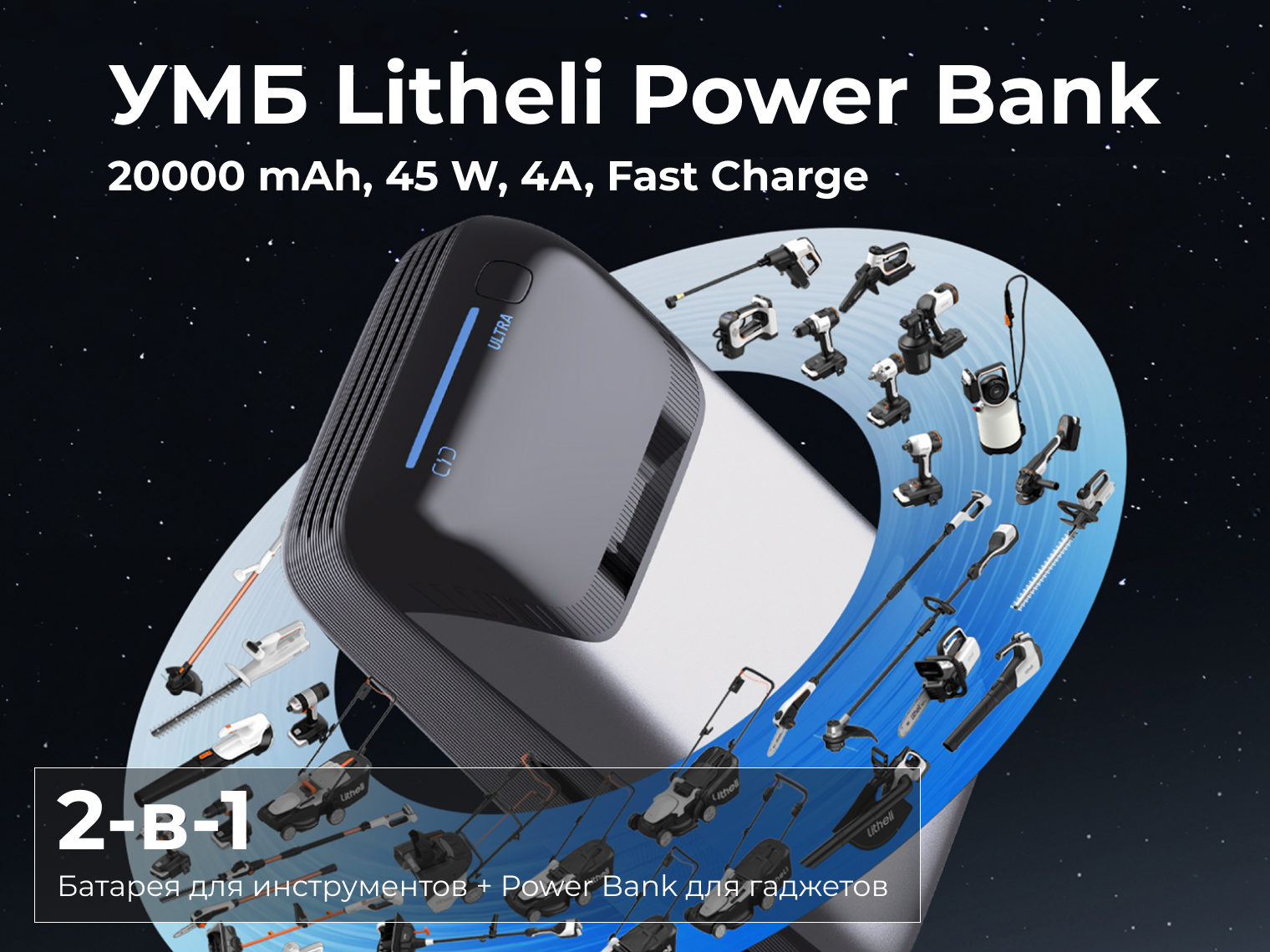 Павербанк Litheli U20 Ultra 4.0 Ah создан как универсальный источник энергии для поездок, работы или дома. Мощность 45 Вт обеспечивает быструю зарядку через порт USB-C не только телефонов, но и ноутбуков. Помимо питания гаджетов, устройство используется как полноценная батарея для инструментов: его можно вставить напрямую в любой прибор линейки Litheli U20.