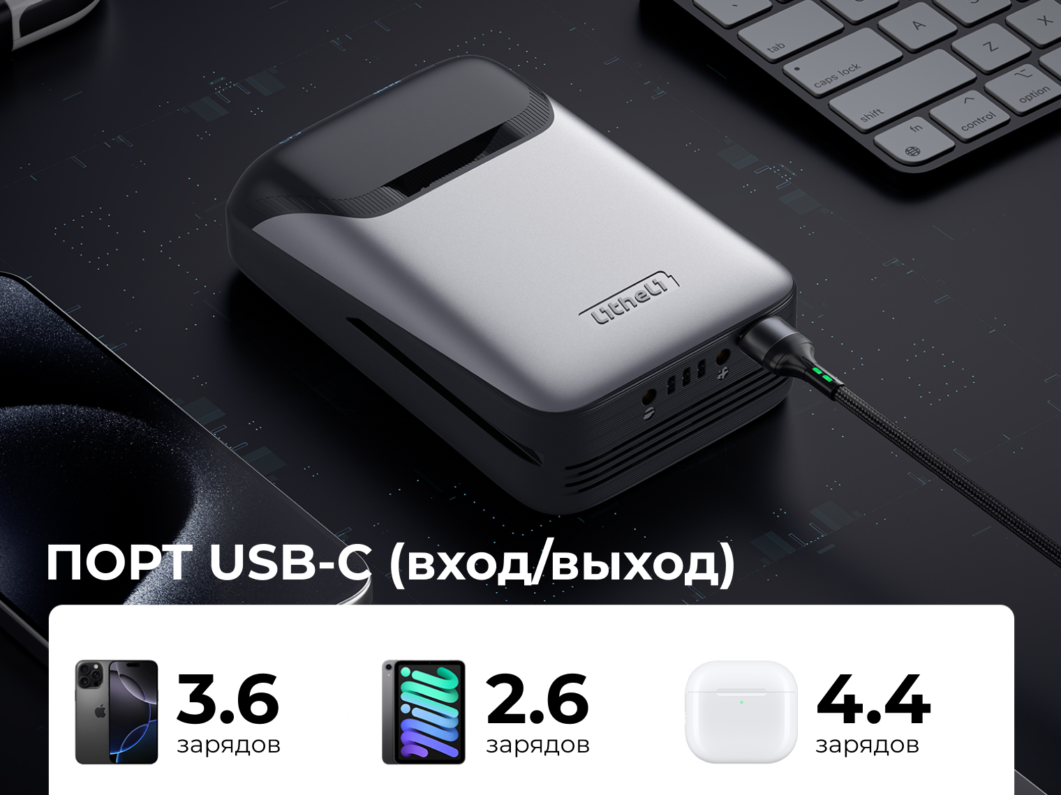 Общая емкость составляет 74 Вт·ч (20 000 мАч). Этого запаса энергии хватает, чтобы 3.6 раза полностью зарядить iPhone 16 Pro или 2.6 раза — iPad mini. Порт USB-C двунаправленный: один и тот же кабель подходит и для зарядки ваших девайсов, и для пополнения энергии самого павербанка.