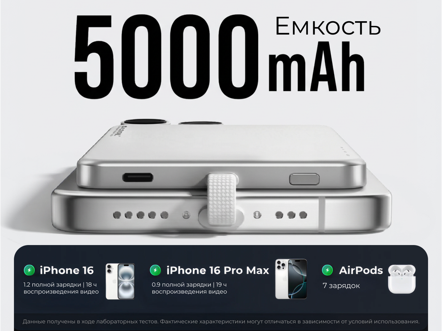 Главная особенность модели — мощные неодимовые магниты. Когда вы подносите повербанк к смартфону, он автоматически притягивается и встает ровно по центру задней панели. Сила магнитов позволяет аккумулятору оставаться на месте, даже если вы активно пользуетесь телефоном, достаете его из кармана или держите одной рукой — устройство не сдвигается и не выпадает.