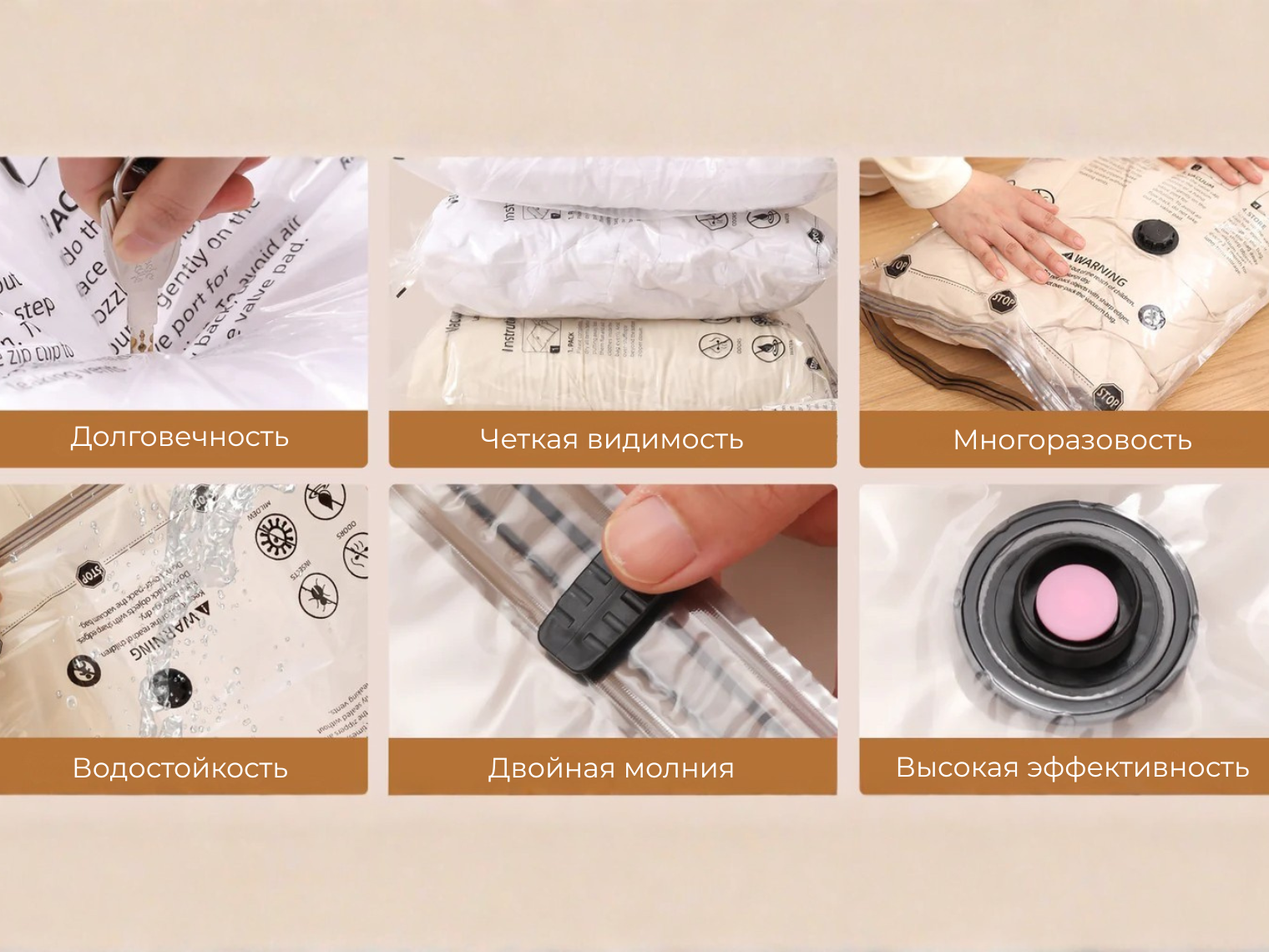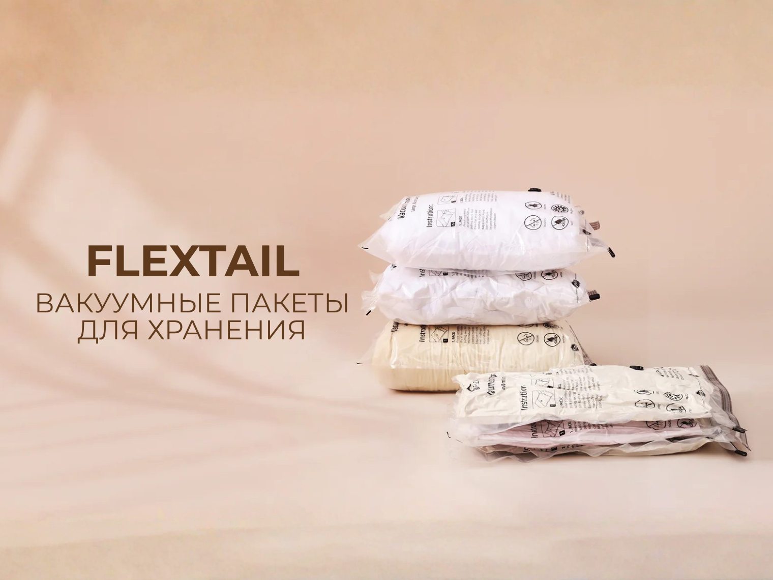 Набор вакуумных пакетов Flextail помогает компактно упаковать сезонную одежду, постельные принадлежности и текстиль для удобного хранения в шкафу, на полке или для перевозки в дорожном чемодане.